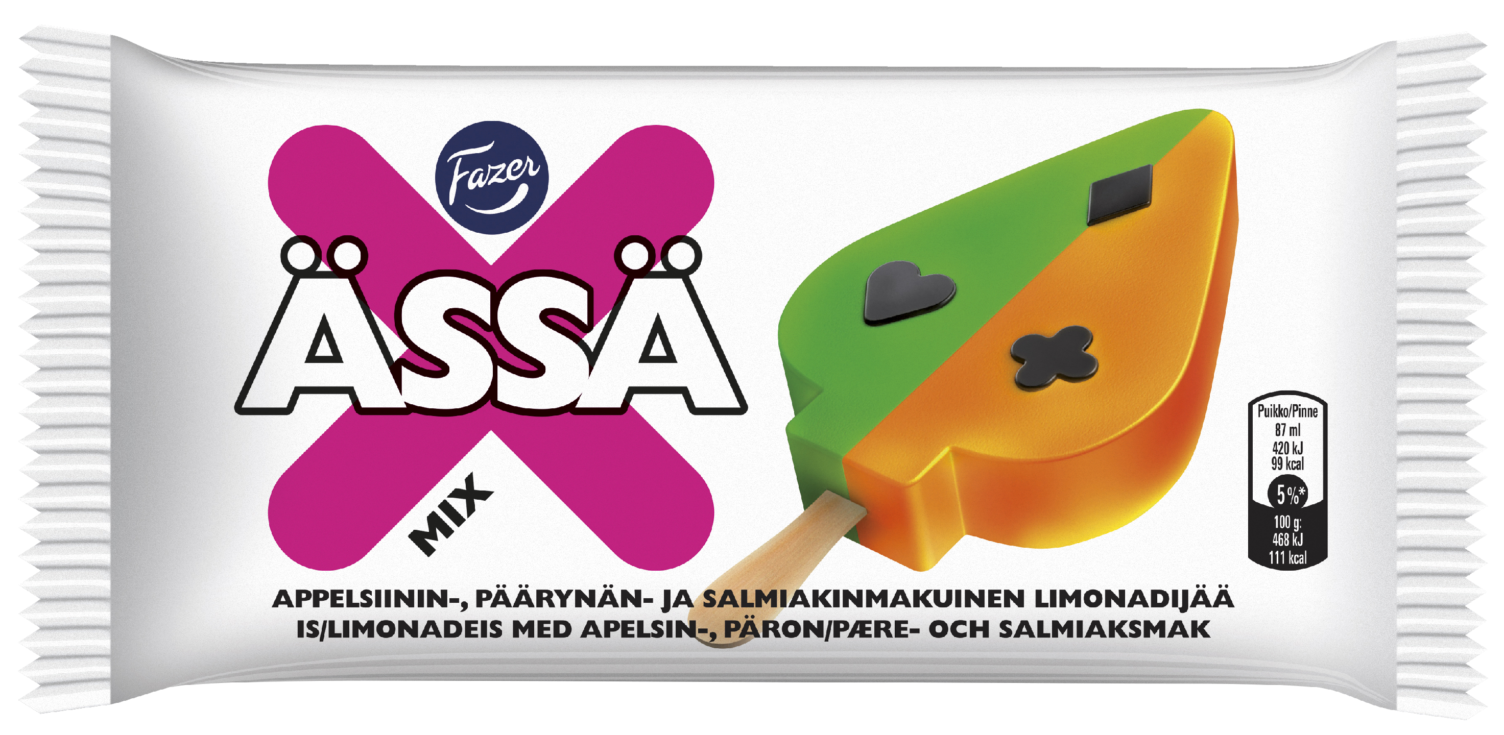 Pirteä yhdistelmä hedelmää ja salmiakkia. Fazer Ässä Mix limonadijääpuikossa yhdistyvät appelsiinin-, päärynän- ja salmiakinmakuinen limonadijää.
