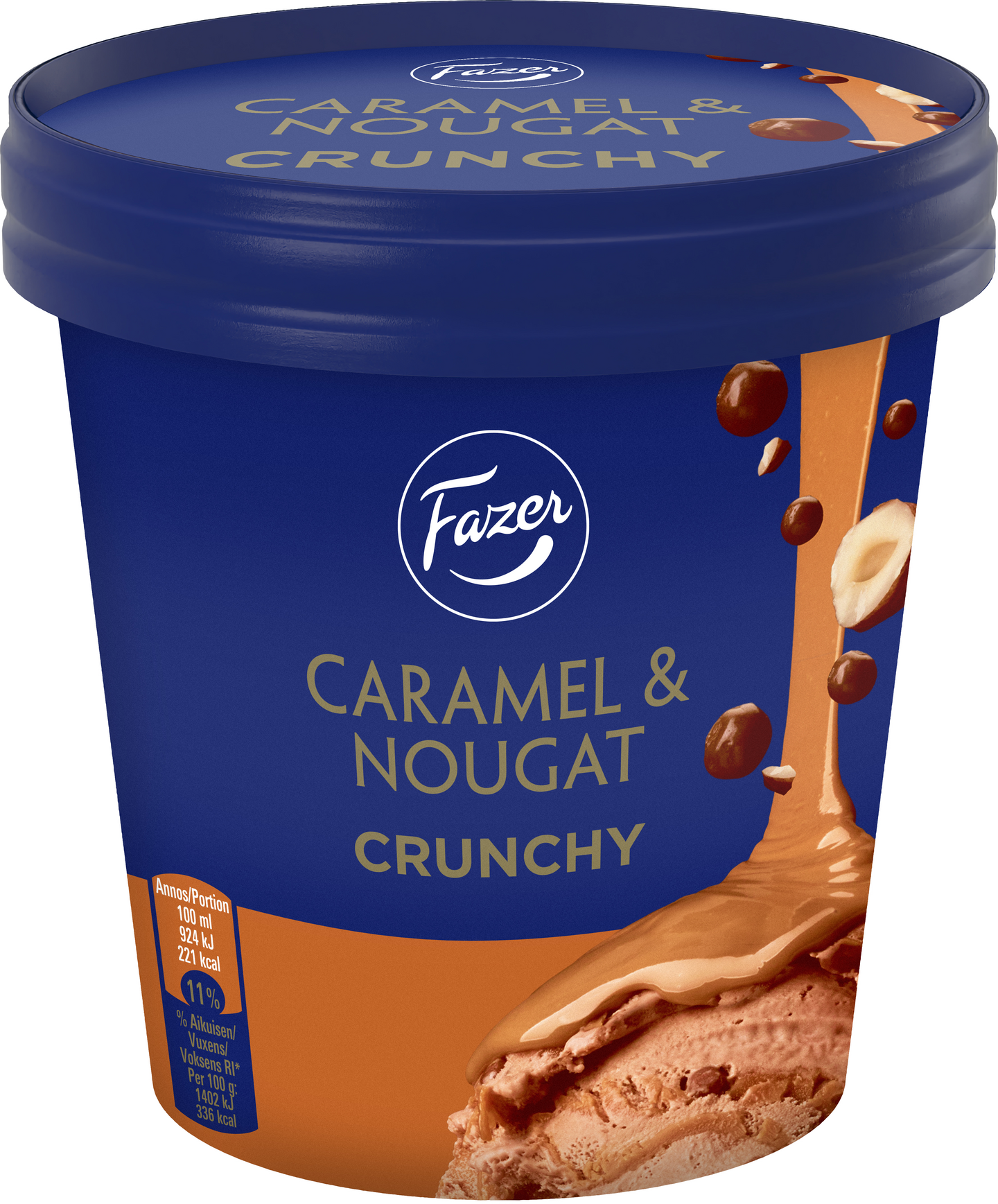 Fazer Caramel & Nougat Crunchy jäätelöpurkissa on sopivasti rapea ja täyteläinen. Hasselpähkinäkaakaokermajäätelön joukossa on toffeekastiketta ja suklaakuorrutteisia rapeita muroja joka lusikalliselle. Fazer-jäätelöt - Maut, joita jo rakastat. Fazer-jäätelöiden tuoteperhe koostuu suosituista Fazerin makeisbrändeistä. Fazer-jäätelöt valmistetaan suomalaisesta kermasta, Turengin jäätelötehtaalla.