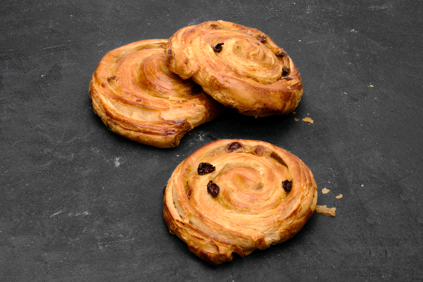 Fazer Croissantwienerin ilmavan ja rapean kierteen sisältä löydät hurmaavaa vanilijakreemiä ja rusinoita.