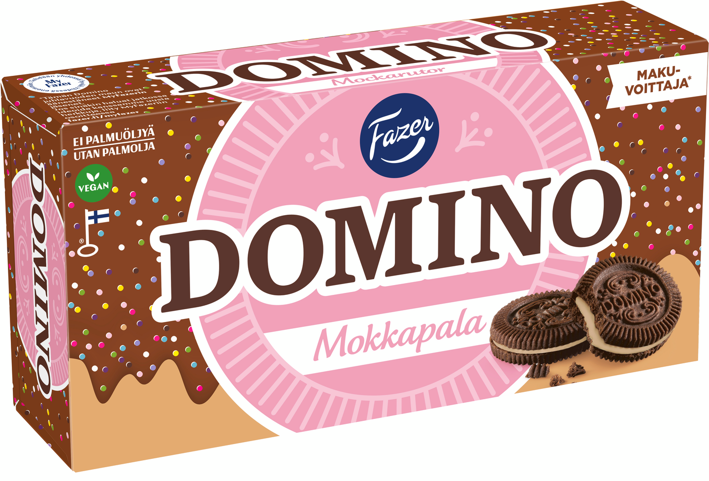 VegaaninenDomino Mokkapala -täytekeksissä kohtaavat kaksi todellista klassikkoa: herkullinen tumma Domino-kaakaokeksi sekä suomalaisten suosikilta mokkapallta maistuva täyte. DOmino Mokkapala -keksit eivät sisällä palumöljyä, ja ne sopivat vegaaneille. Noudatamme kaakaonhankinnassamme Fazerin kaakaovisiota. Lue lisää www.fazercocoavision.com. Tarjoa maistuvia Domino Mokkapala -keksejä kahvipöydässä ja nautiskele arjessa ja juhlassa.