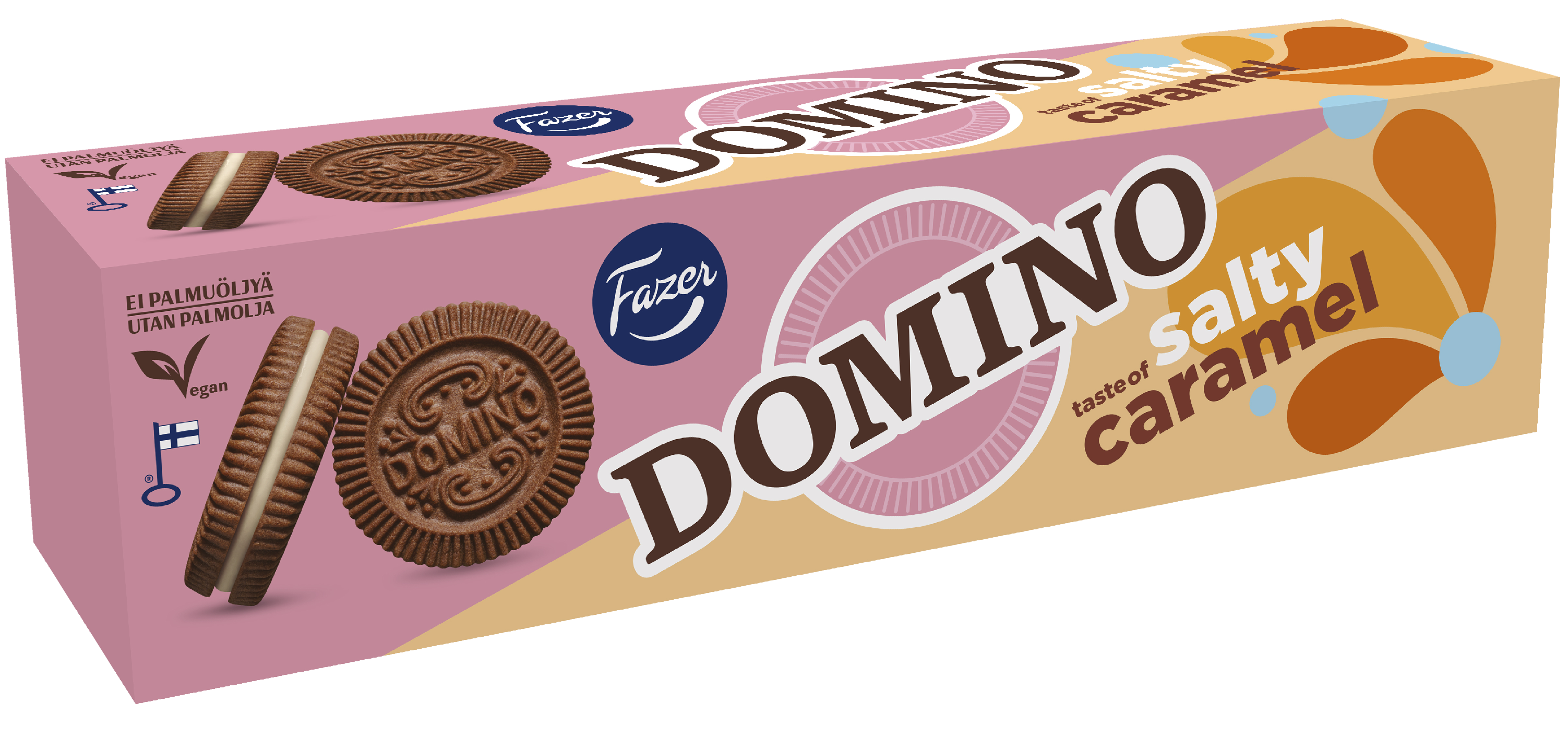 VegaaninenDomino Salty Caramel -täytekeksissä kohtaavat herkullinen tumma Domino-kaakaokeksi sekä Salty Caramelilta maistuva täyte. Noudatamme kaakaonhankinnassamme Fazerin kaakaovisiota. Lue lisää www.fazercocoavision.com. Nautiskele Domino Salty Caramel -täytekeksejä arjessa ja juhlassa. Domino Salty Caramel -keksit eivät sisällä palmuöljyä ja ne sopivat myös vegaaneille.