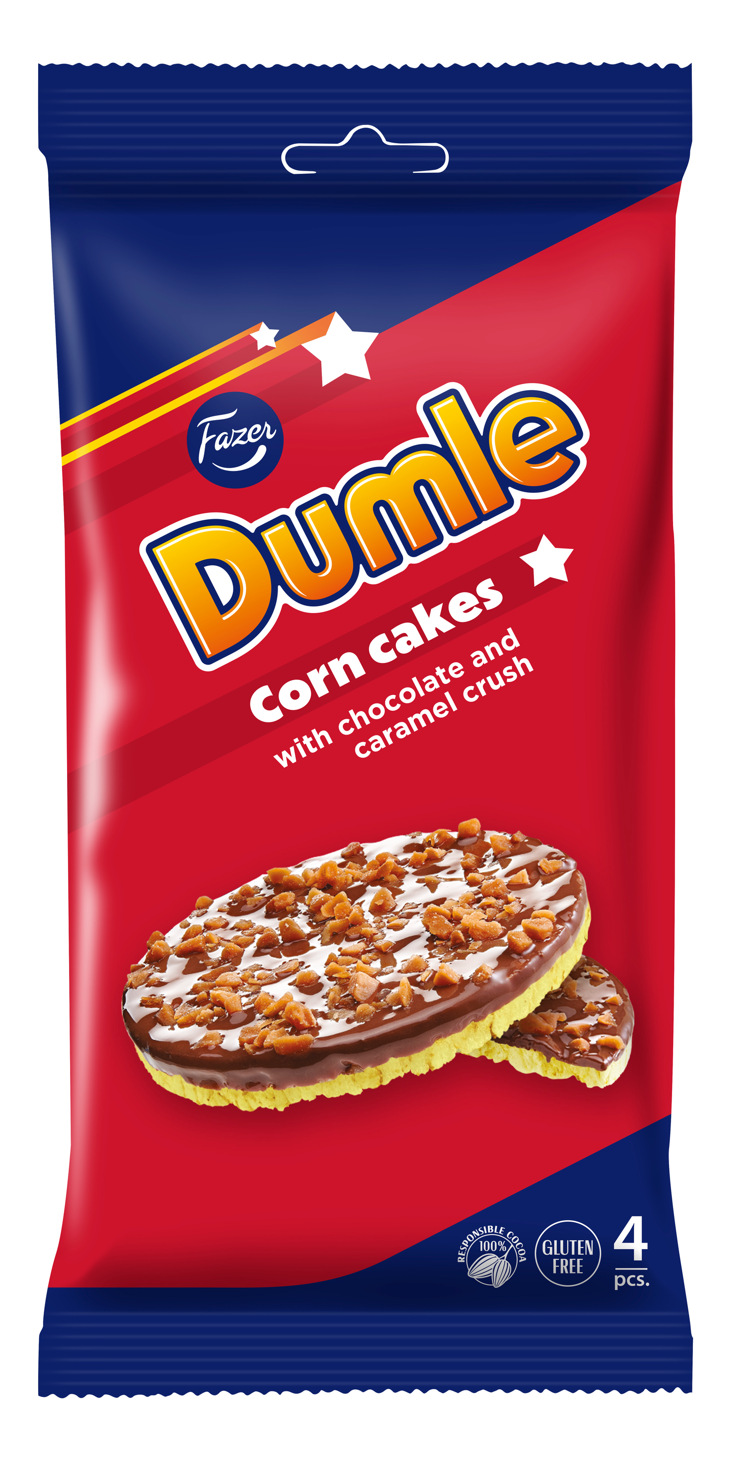 Dumle maissikakut ovat herkullinen yhdistelmä rapeaa maissikakkua, toffeenmakuista suklaakuorrutetta ja päälle ripoteltua suolakaramellirouhetta. Neljän maissikakun pakkaus sopii kotoisiin herkutteluhetkiin ja maistuvaksi välipalaksi. Dumle maissikakut ovat gluteenittomia ja suklaakuorrute on Noudatamme kaakaonhankinnassamme Fazerin kaakaovisiota. Lue lisää www.fazercocoavision.com.