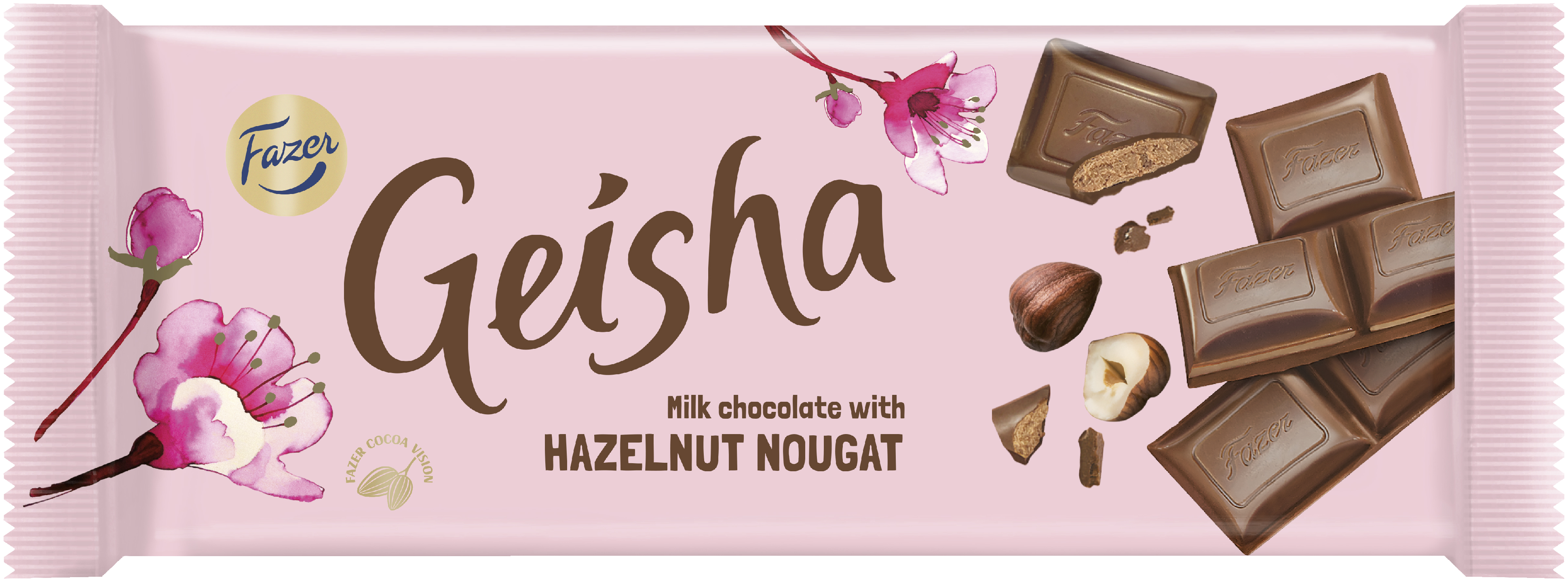 Geishan pehmeä maitosuklaa kätkee sisäänsä hasselpähkinänougat-täytteen. Herkullisen rapean täytteen ja ylellisen suklaan liitto hurmaa ihanassa suklaalevyssä. Mikä parasta, tämä herkullinen Geisha-suklaa on valmistettu ilman palmyöljyä. Noudatamme kaakaonhankinnassamme Fazerin kaakaovisiota. Lue lisää www.fazercocoavision.com. Pysähdy hetkeksi nauttimaan pari palaa Geisha-suklaata tai tarjoa rakkaillesi hetki yhteistä aikaa.