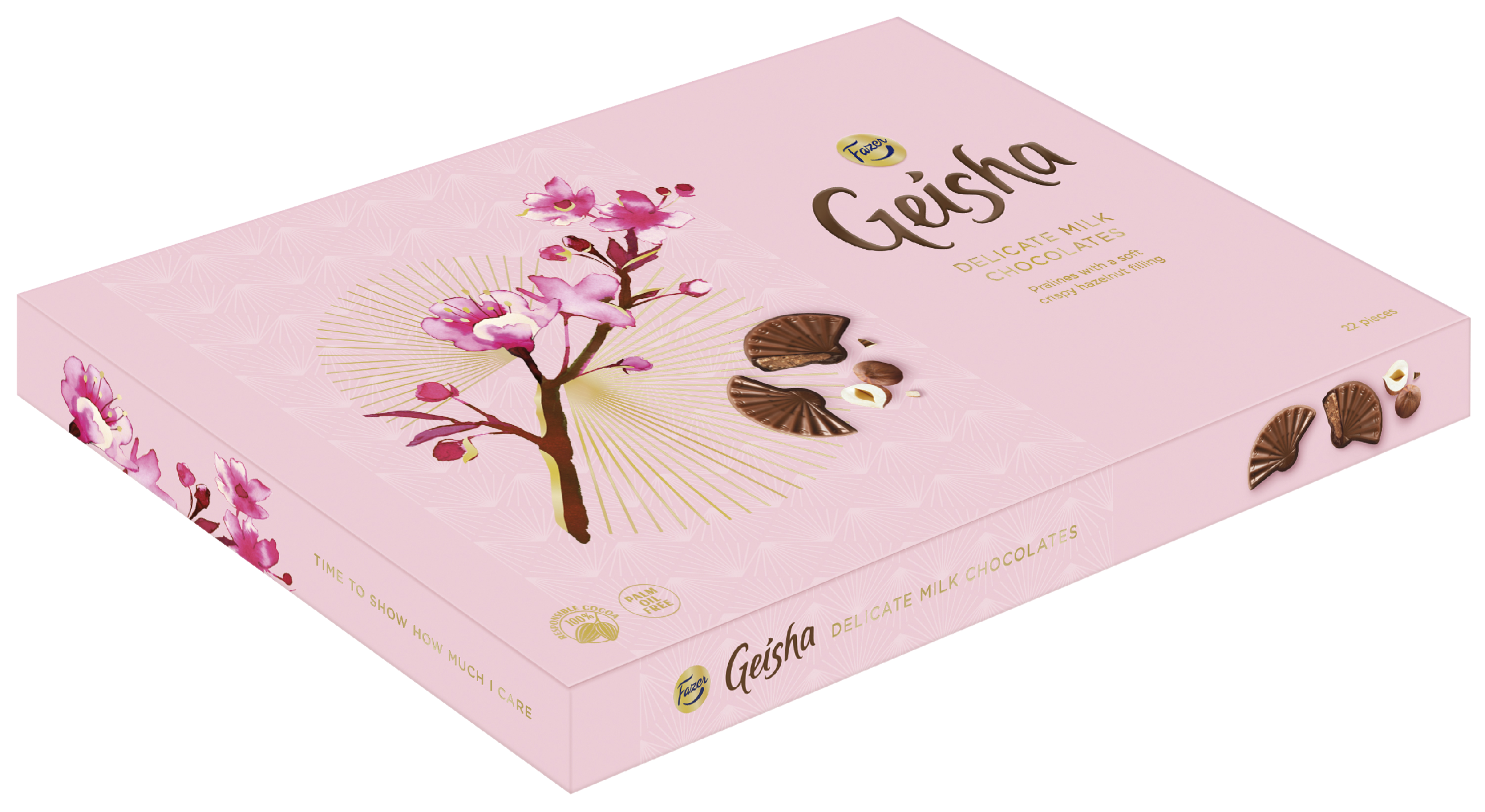 Geishan pehmeä suklaa kätkee sisäänsä hasselpähkinänougat-täytteen. Geisha Selection on harmoninen valikoima viuhkanmuotoisia maitosuklaakonvehteja, joiden sisällä maistuu rapea täyte. Irrottaudu hetkeksi arjesta ja nauti konvehti tai pari. Kaunis Geisha-rasia on myös lahja, joka muistetaan.Noudatamme kaakaonhankinnassamme Fazerin kaakaovisiota. Lue lisää www.fazercocoavision.com.