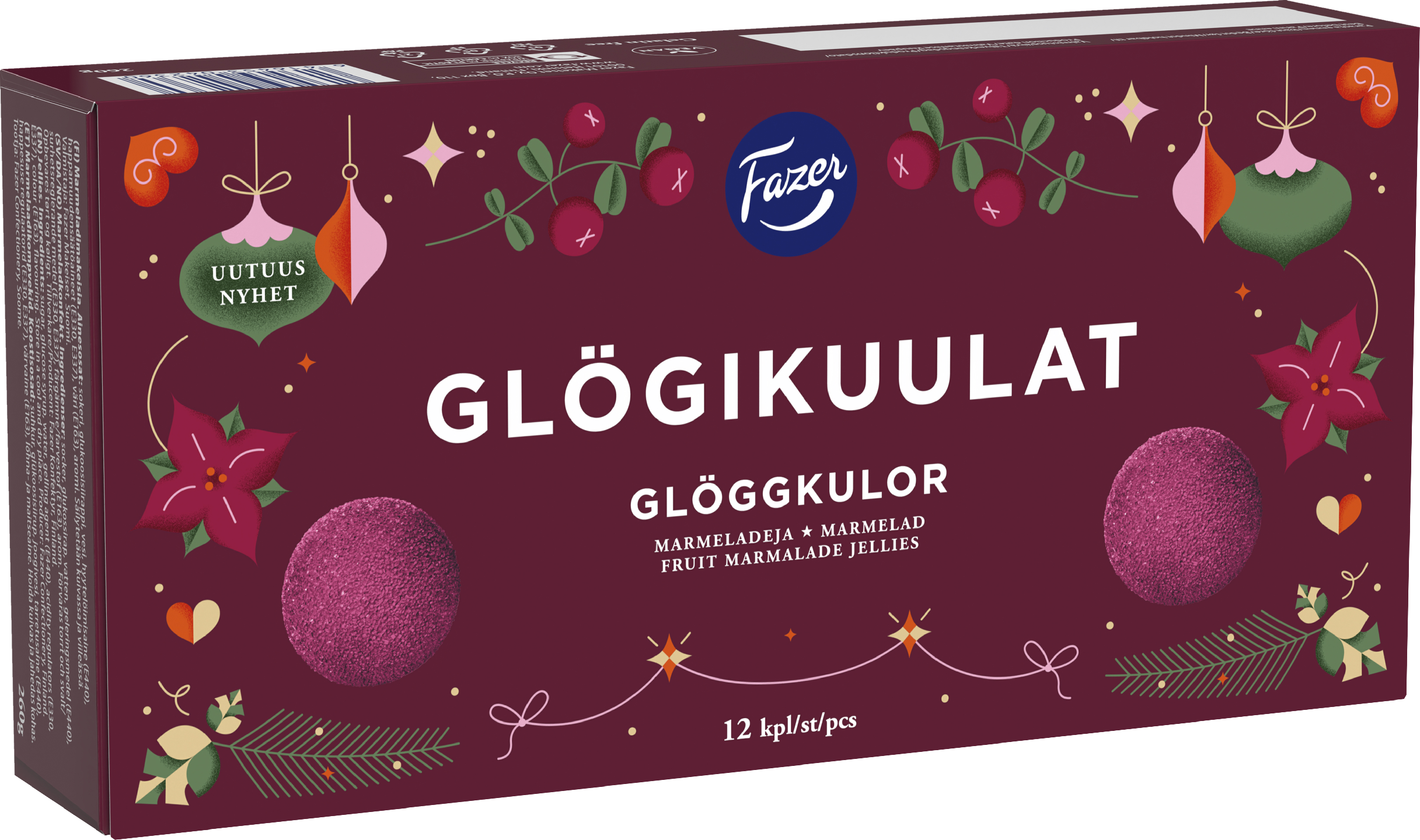 VegaaninenFazerin Glögikuulat hurmaavat maullaan. Pehmeät ja makeat Glögikuulat eivät sisällä gluteenia, liivatetta tai laktoosia ja sopivat myös vegaaneille. Kauniit Glögikuulat on ilo laittaa esille, kun on juhlan aika. Kokeile myös Glögikuulista tehtyä ihanaa lämmintä juomaa, jonka reseptin löydät pakkauksesta.