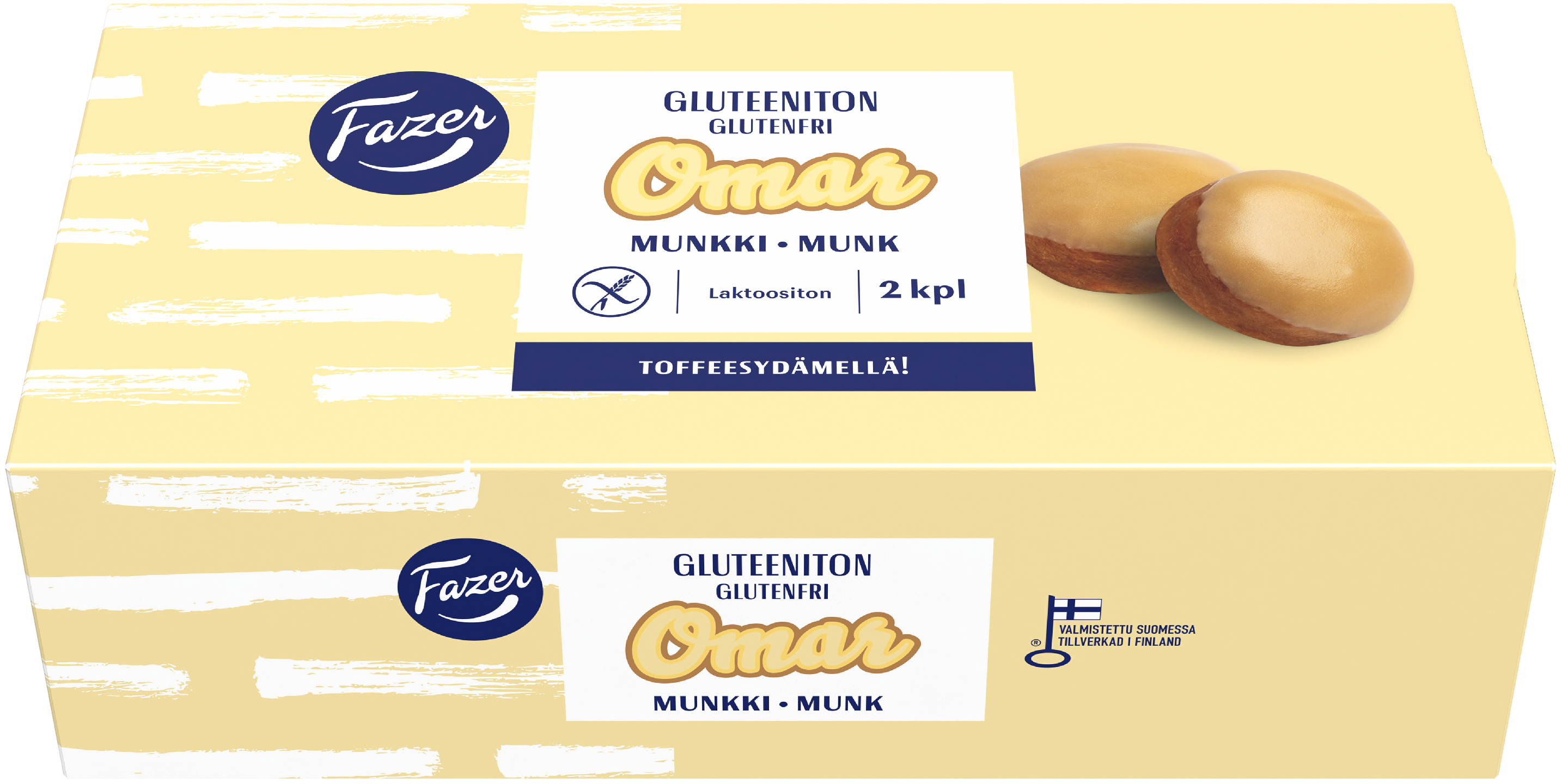 LaktoositonFazer Gluteeniton Omar -munkki hurmaa herkkuhetken. Klassikkomakeista mukaileva munkki ihastuttaa toffeetäytteellään ja suussa sulavalla kuorrutteellaan. Sulattamalla valmis.