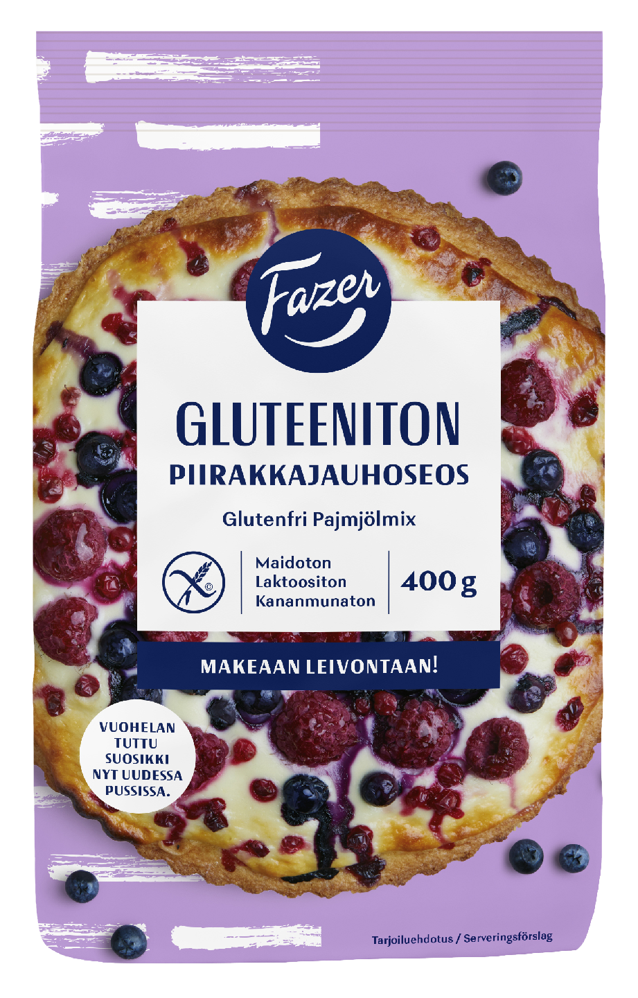 VegaaninenFazer Gluteeniton Piirakkajauhoseoksesta paistuu vaivattomasti makeat piirakat, kahvikakut, muffinit sekä kakkupohjat. Lisää reseptejä: fazer.fi/gluteeniton.