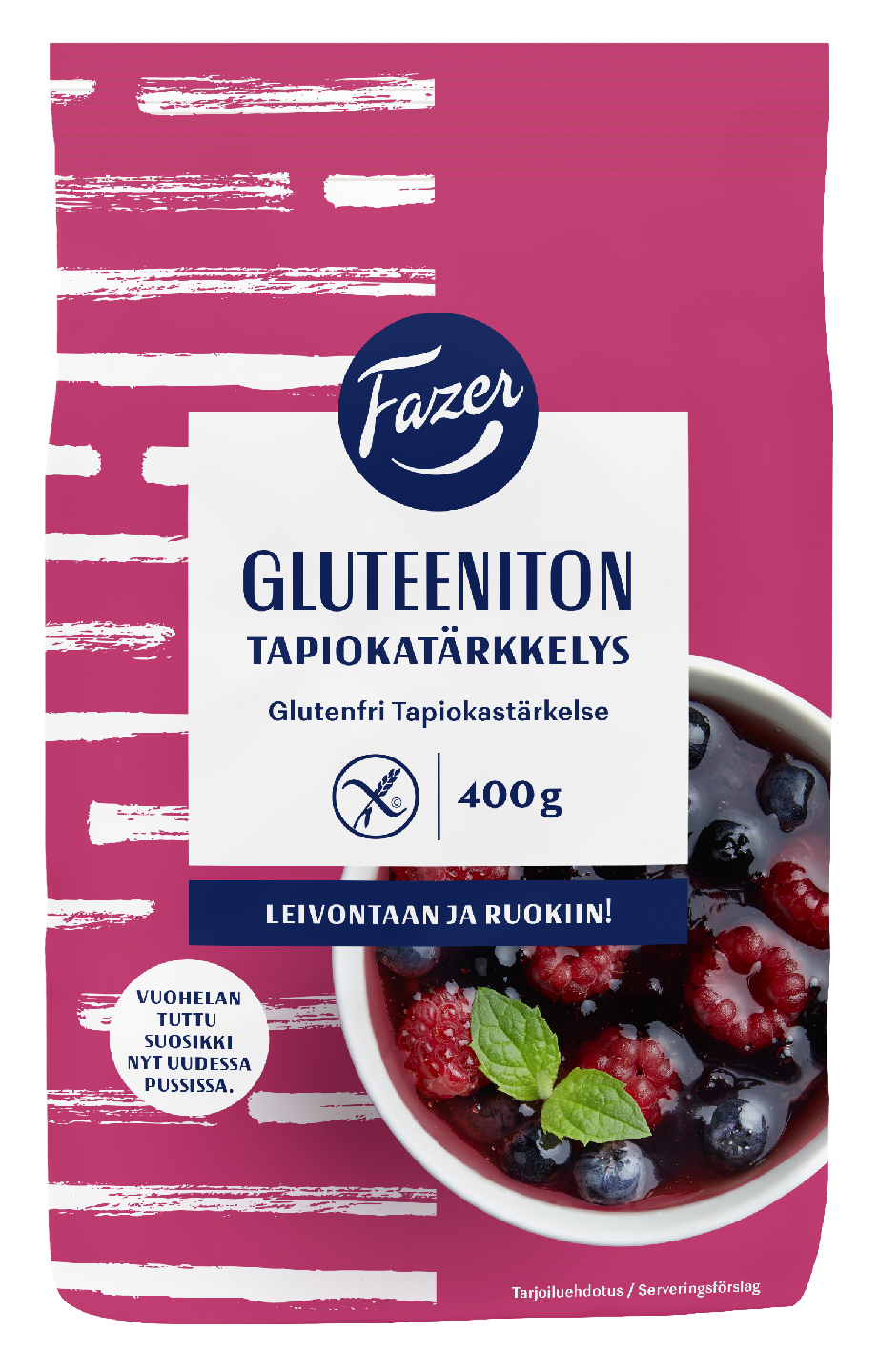 VegaaninenFazer Gluteeniton Tapiokatärkkelys sopii suurustamiseen, leivontaan sekä kananmunan korvikkeeksi. Lisää reseptejä: fazer.fi/gluteeniton.