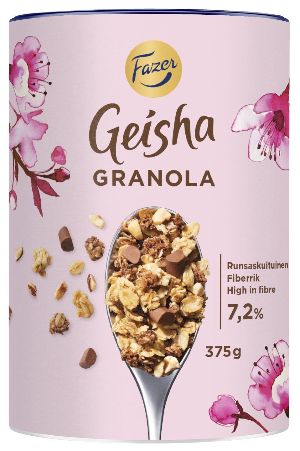 RunsaskuituinenIhastuttavan Fazer Geishan makumaailma yhdistettynä kauragranolaan. Rapeaksi paahdettua täysjyväkauraa, maitosuklaata ja hasselpähkinän paloja. Tuote on runsaskuituinen.