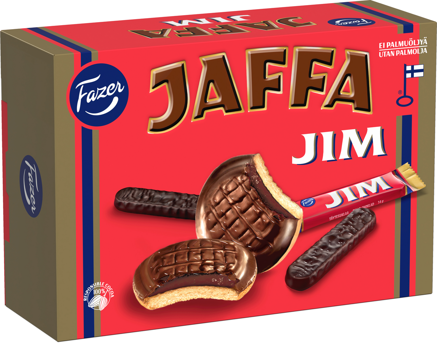 Jaffa JIM -leivoskeksi yhdistää kaksi klassikkoa, Jaffa-keksin ja JIM-suklaapatukasta tutun hedelmänmakuisen täytteen. Mikä parasta, keksi leivotaan ilman palmuöljyä. Noudatamme kaakaonhankinnassamme Fazerin kaakaovisiota. Lue lisää www.fazercocoavision.com. Koko perheen suosikkikeksit maistuvat juhlissa tai kahvipöydässä.