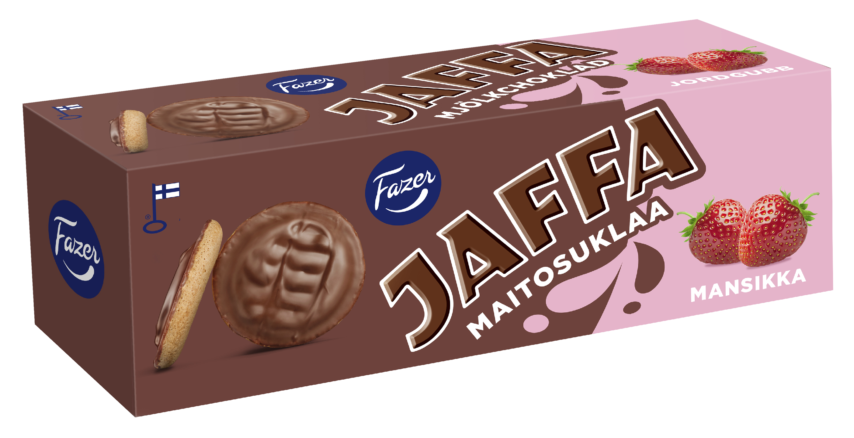 Jaffa Maitosuklaa Mansikka on leivoskeksi, jossa on kuohkean pehmeän leivospohjan päällä marmeladia ja herkullista maitosuklaata. Jaffa Maitosuklaa Mansikka keksi tuo kesän maut kielelle vaikka keskellä synkintä syksyä tai kylmintä pakkaspäivää! Noudatamme kaakaonhankinnassamme Fazerin kaakaovisiota. Lue lisää www.fazercocoavision.com. Koko perheen suosikkikeksit maistuvat kemuissa tai kahvipöydässä.