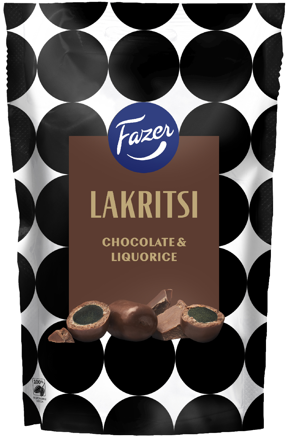 Pehmeä Fazer Lakritsi on saanut suklaa kuorrutuksen Fazerin sinisestä suklaasta. Kun pehmeä lakritsi kohtaa Fazerin täyteläisen maitosuklaan syntyy jotain vastustamatonta. Nauti lakrtisipussi yksin tai jaa ystävän kanssa!