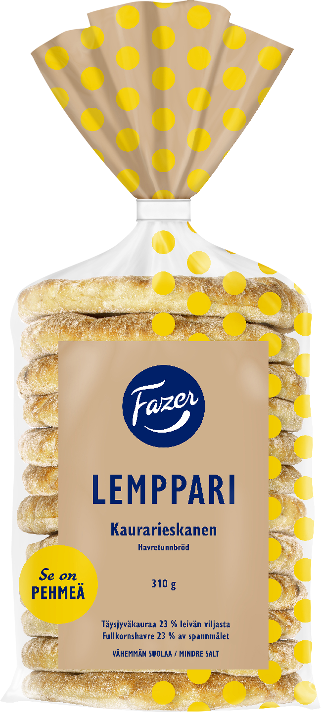 VegaaninenFazer Lemppari Kaurarieskanen on pieni pyöreä rieska, jossa on mukana maukasta täysjyväkauraa. Tämä herkullinen ja pehmeä rieskanen sisältää vähemmän suolaa ja sopii täydellisesti niin aamiaispöytään kuin välipalaksi. Maistuu koko perheelle!