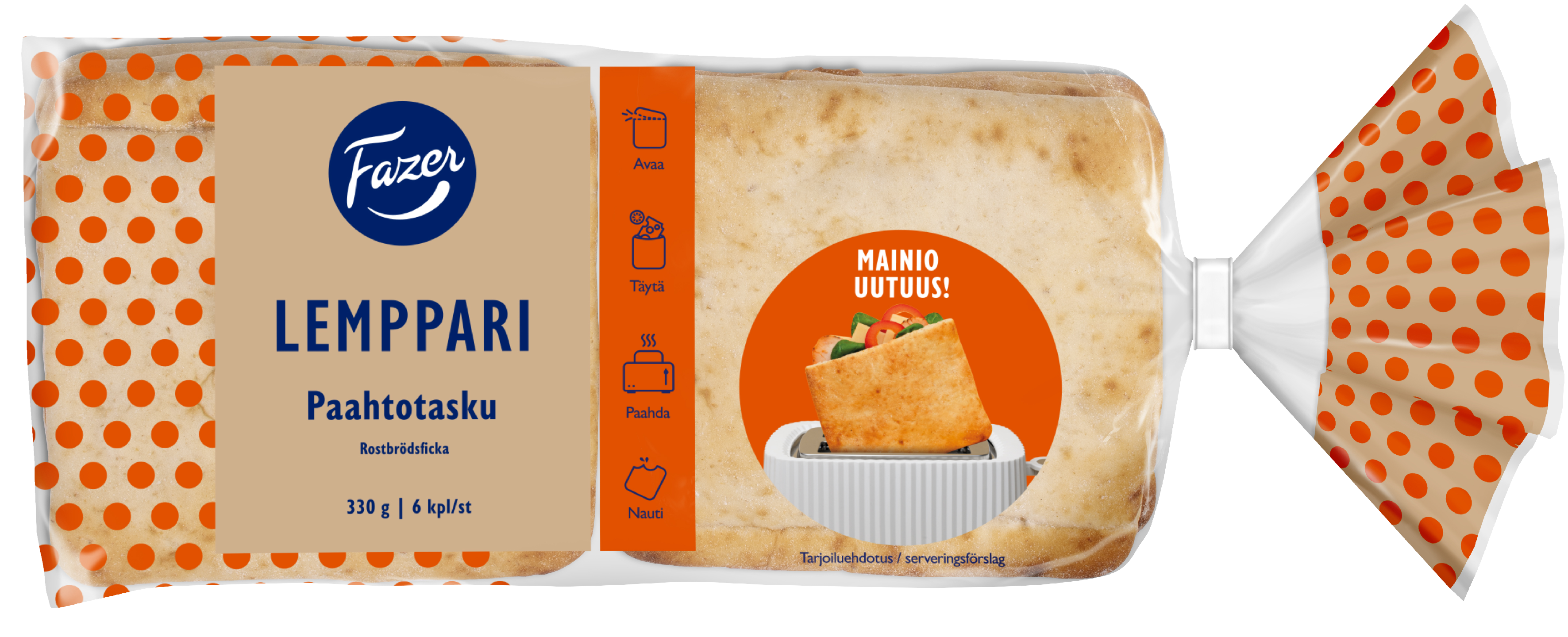VegaaninenFazer Lemppari Paahtotasku on täysin uudenlainen täytettävä vaalea leipä, josta loihdit helposti herkulliset toastit ja lämpimät voileivät. Paahtotaskussa on yläreunassa avauskohta, josta saat laitettua valitsemasi täytteet sisään. Täytetty leipä paahtuu paahtimessa hetkessä herkulliseksi toastiksi.