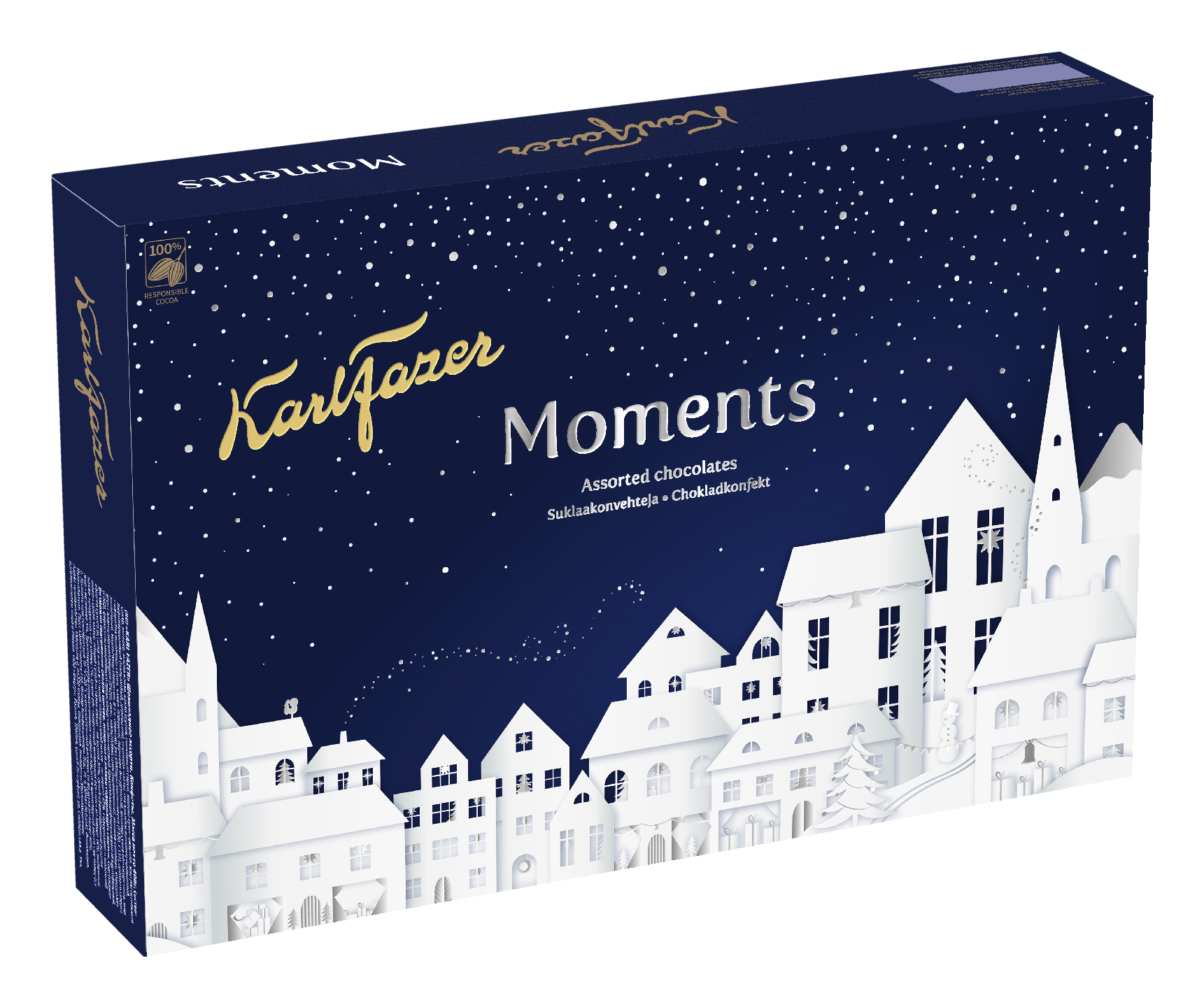 Karl Fazer on Suomen rakastetuin suklaa, jonka ainutlaatuisen täyteläisen maun ovat taanneet parhaat raaka-aineet jo vuodesta 1922 saakka. Karl Fazer Moments -konvehtirasia sisältää Fazerin suussa sulavia suosikkisuklaita kahdessa kerroksessa. Rasiassa on 44 konvehtia ja 6 suosittua makua: vadelmajogurtti, kaakaotryffeli, maitosuklaa & valkoinen suklaa, karpalo, cappuccino ja caramel. Tyylikkäästä rasiasta riittää makunautintoja useammankin ystävän kesken jaettavaksi. Noudatamme kaakaonhankinnassamme Fazerin kaakaovisiota. Lue lisää www.fazercocoavision.com.