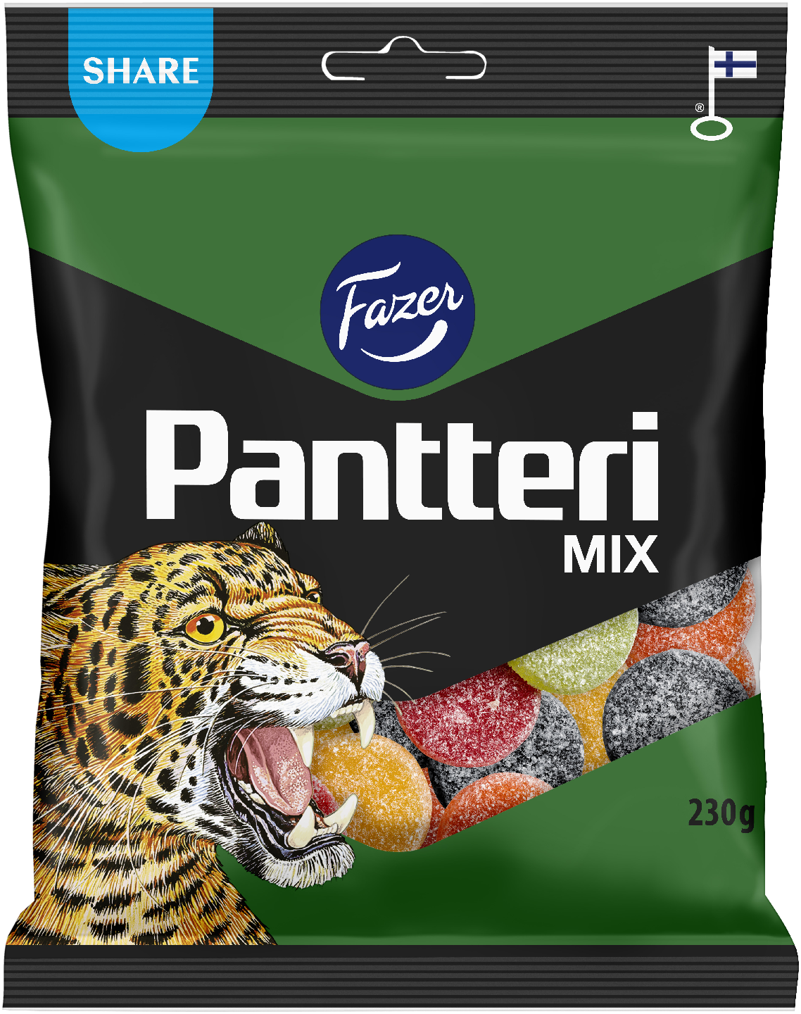 Pantteri on makeansuolainen salmiakki, joka tuo kissaeläimen vaistosi esiin. Klassikkomakeinen karjaisee entistäkin kovemmin Pantteri Mix karkkipussissa, joka on ketterä yhdistelmä salmiakin- ja hedelmänmakuisia karkkeja. Karkit ovat laktoosittomia. Uusi keskikokoinen pussi sopii täydellisesti petomaisen herkulliseen iltaan kaverin kanssa!