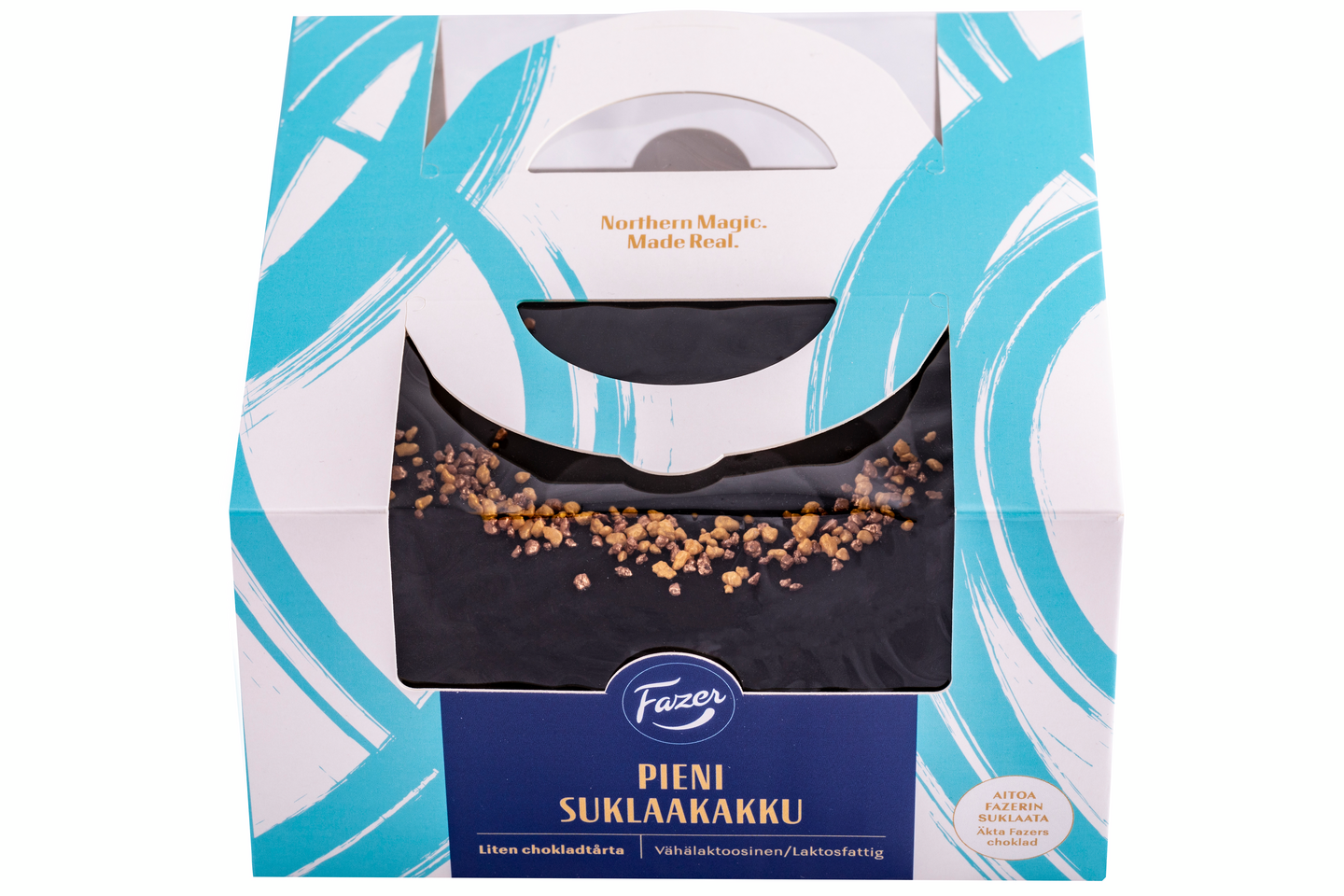 Fazer Pieni suklaakakku ihastuttaa samettisella suklaisuudellaan ja pienellä koollaan. Kevyen ja ilmavan suklaisen moussekakun kruunaa kiiltävä suklaakuorrute ja kaunis kultainen koristelu.Kakku on ihana tarjottava pieneen juhlaan tai arkiseen hemmotteluun. Kakku on mitoitettu 4-6 henkilölle.