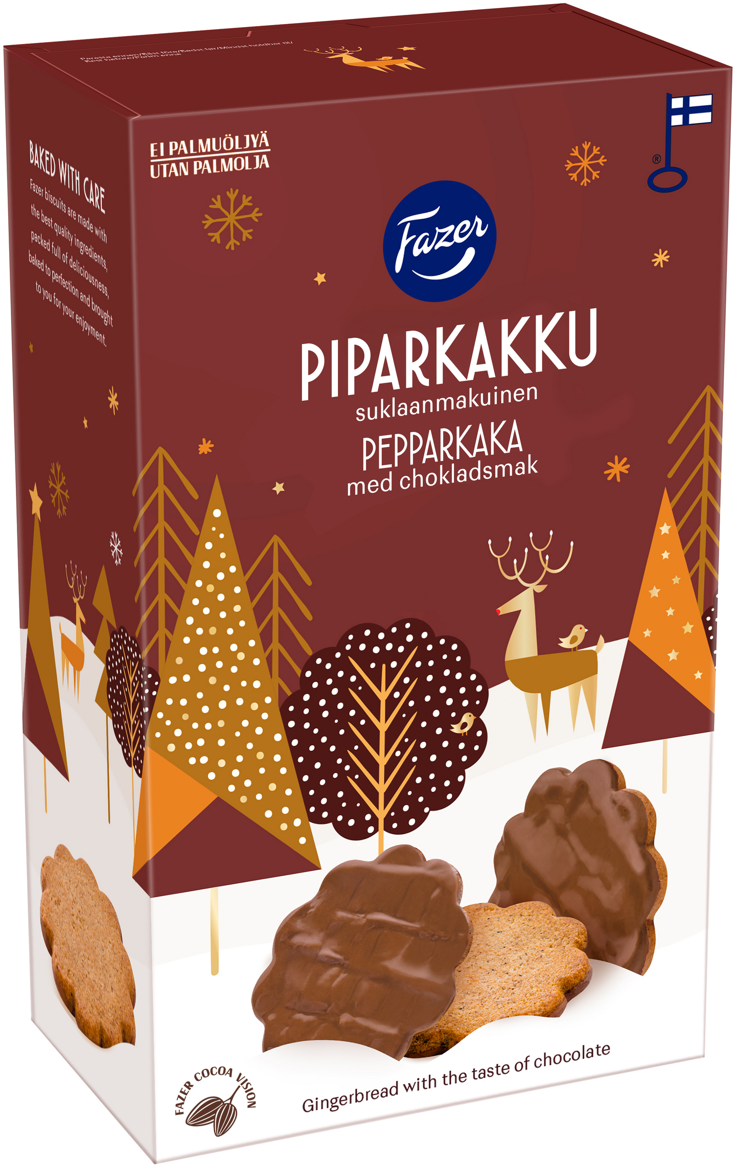 Fazerin maitosuklaanmakuisella kuorrutteella päällystetty pieni herkullinen piparkakku maistuu sopivasti joulun mausteilta ja se on herkullinen tarjottava joulun alusajan juhlissa. Pienet piparkakut ovat juuri sopivan kokoisia tarjottavaksi vaikkapa glögin kanssa. Kaunis pakkaus sopii hyvin myös jouluiseksi tuliaiseksi. Piparit on valmistettu ilman palmuöljyä.Noudatamme kaakaonhankinnassamme Fazerin kaakaovisiota. Lue lisää www.fazercocoavision.com.
