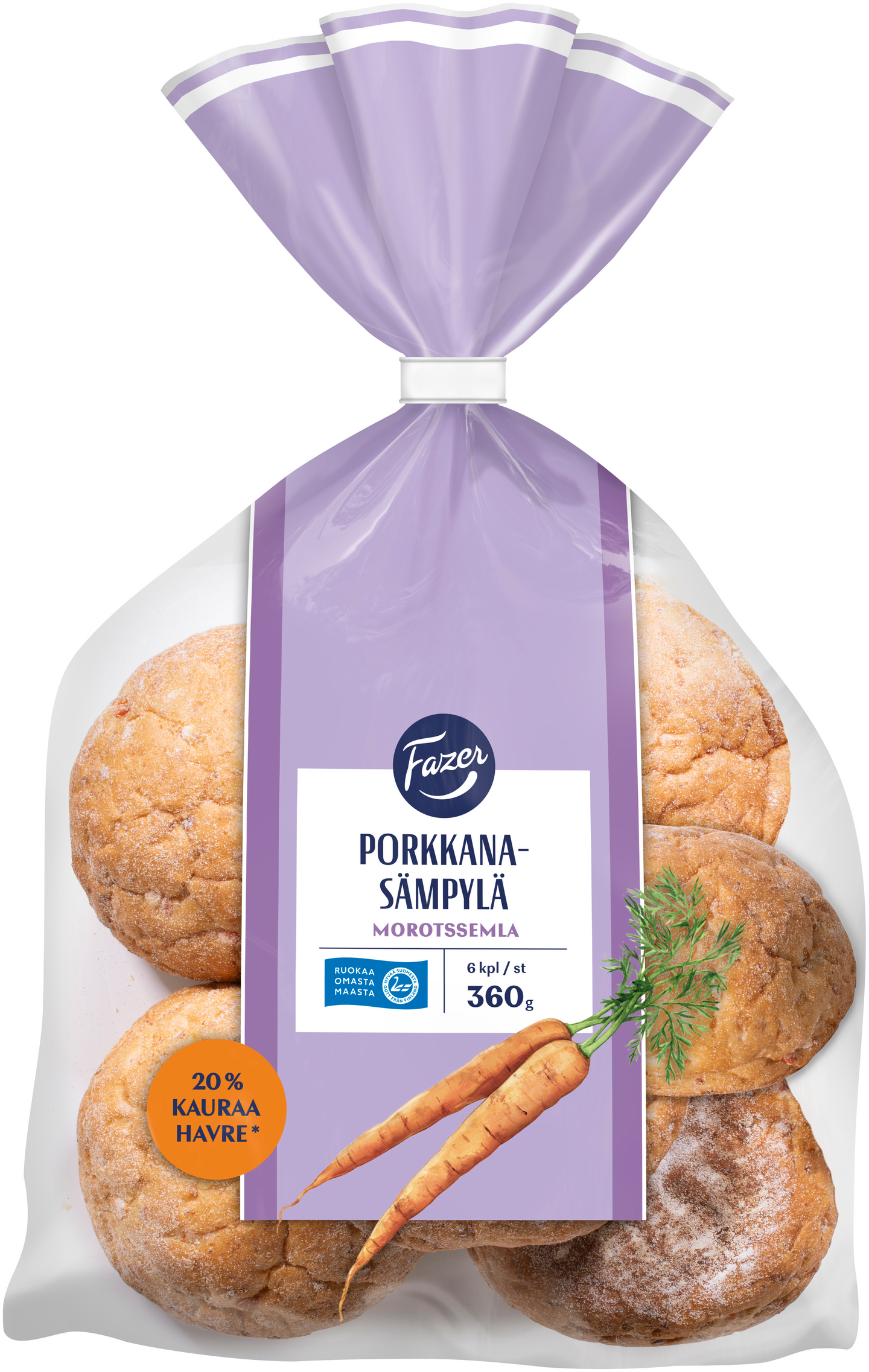 VegaaninenFazer Porkkanasämpylä on pehmeän mehevä uutuussämpylä niin arjen kuin viikonlopun moniin leipähetkiin. Porkkana ja kauranjyvät tuovat sämpylään mukavaa purutuntumaa sekä aavistuksen makeutta. Tämä herkullinen sämpylä maistuu koko perheelle! Sämpylät on leivottu Suomessa.
