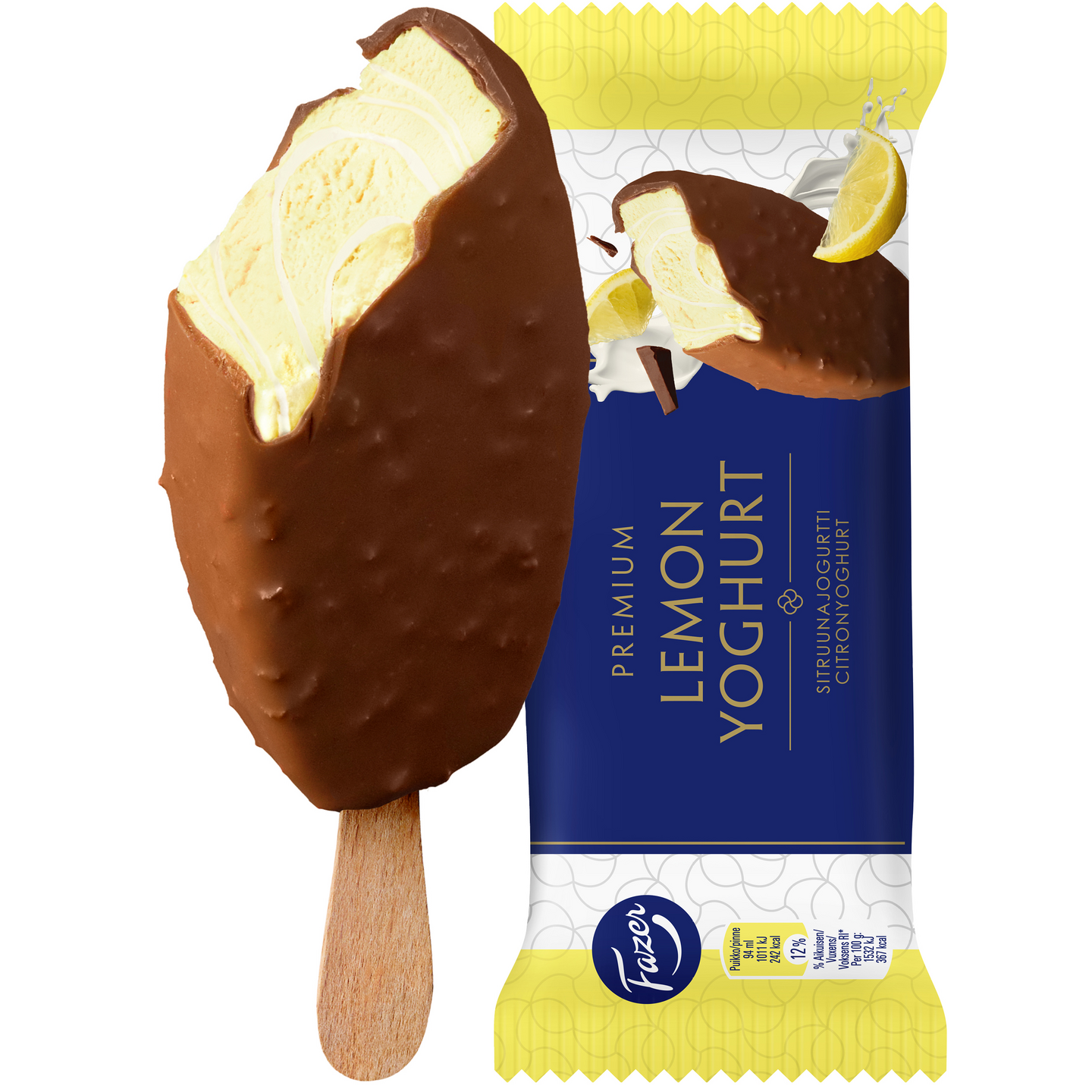 Fazer Premium Lemon Yoghurt jäätelöpuikko - raikas sitruunainen herkku jäätelöaltaassa. Samettisen pehmeää sitruunanmakuista kermajäätelöä, raikasta jogurttitäytettä käärittynä herkulliseen maitosuklaakuorrutteeseen jossa raikkaita sitruunahippuja.