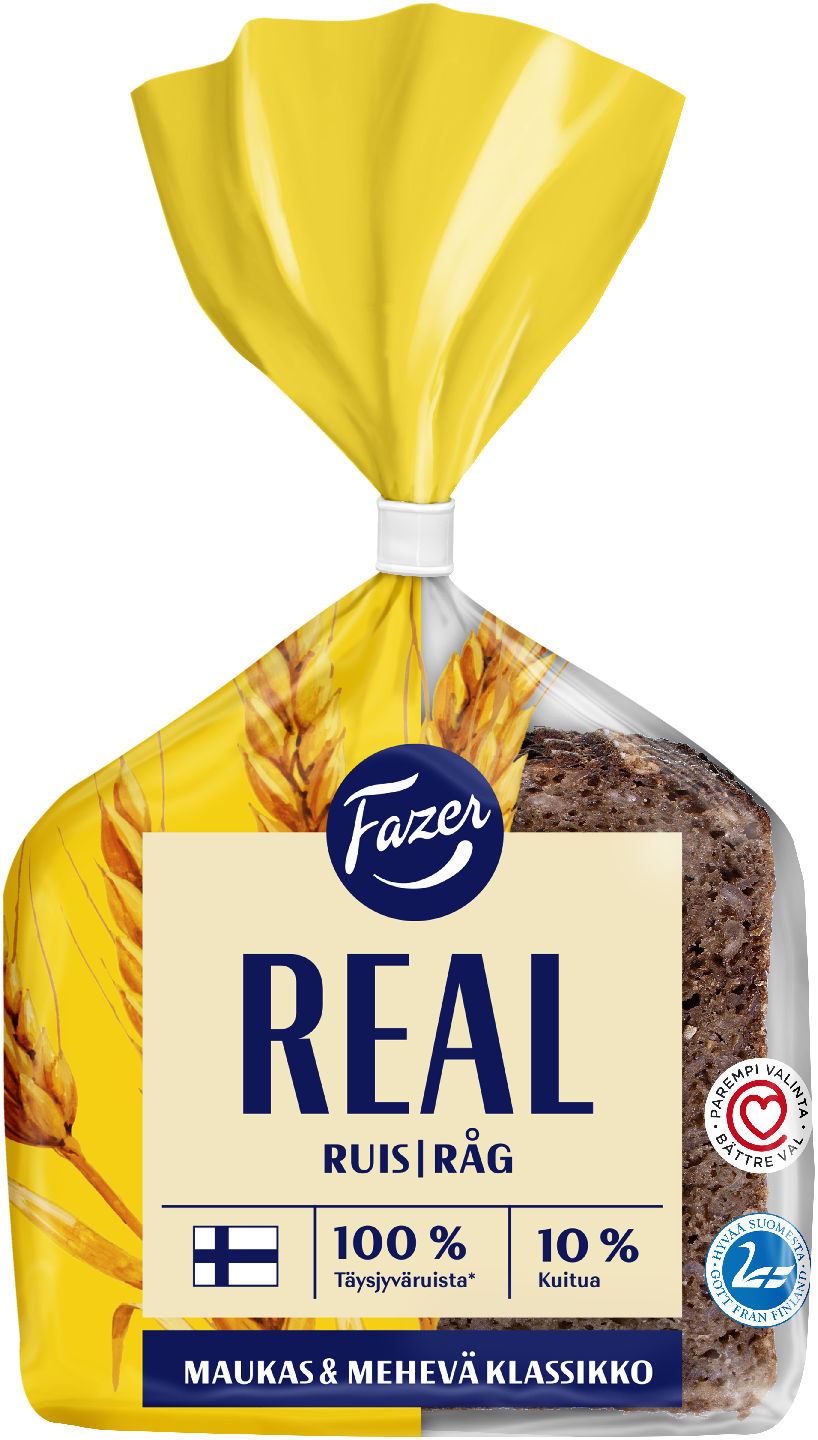 VegaaninenFazer Real Ruis on klassikko, jossa herkullinen maku on yhdistetty rukiin hyviin ominaisuuksiin. Se on leivottu 100-prosenttisesti täysjyvärukiista, joten se on runsaskuituinen. Syömällä Fazer Real Ruista saat joka viipaleen mukana kaikki rukiin hyvät ominaisuudet luonnollisessa muodossa. Fazer Real Ruis on lisäksi lisäaineeton ja sille on myönnetty Sydänmerkki. Kokeile Fazer Real -leipiä myös paahdettuna!