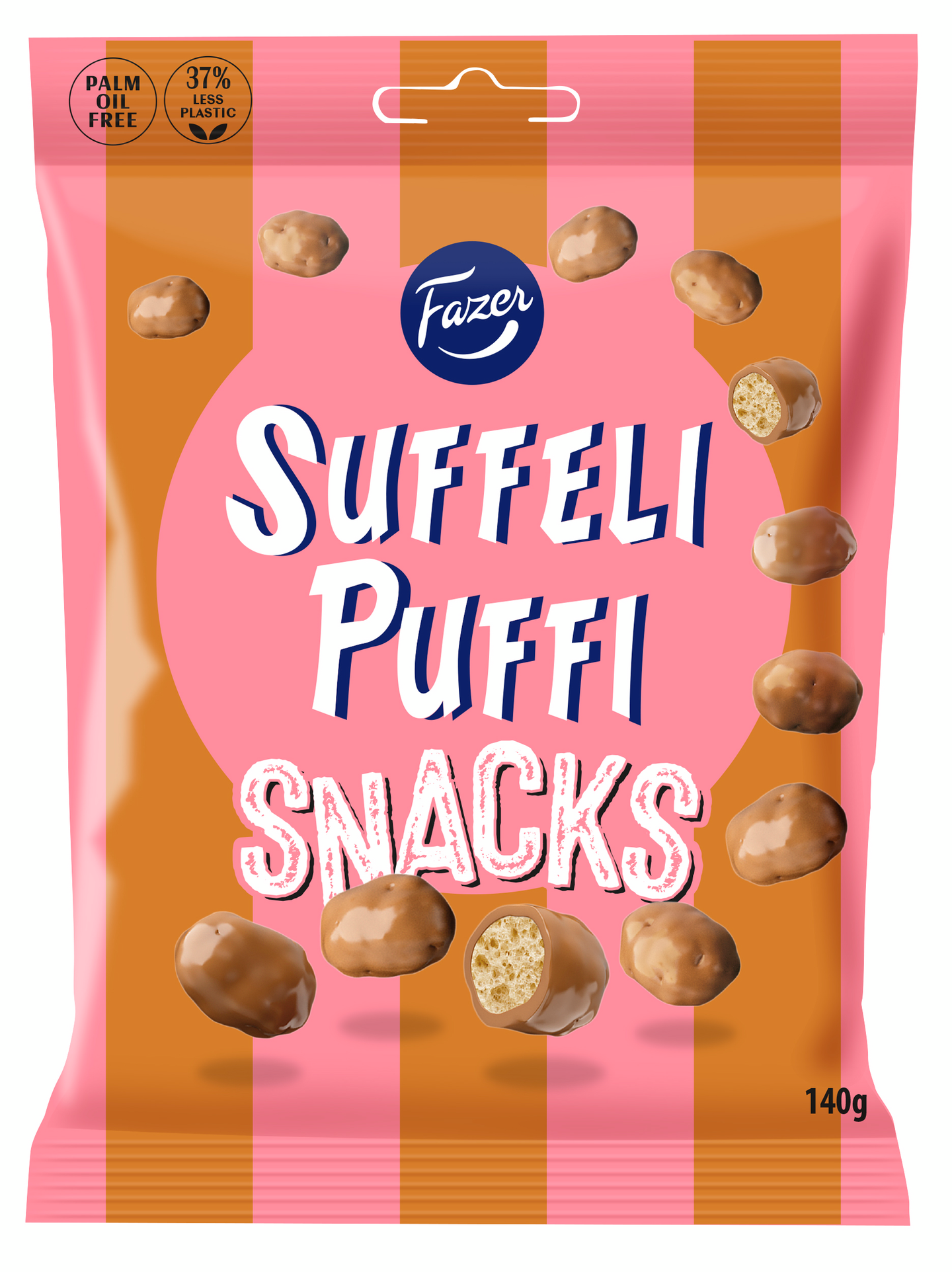 Suffeli on rapea klassikko, joka on ihastuttanut jo vuodesta 1966. Suffeli Puffi Snacks -makeisten suklaanmakuisen kuorrutteen alta paljastuu ihanasti rouskahtava maissipuffi. Noudatamme kaakaonhankinnassamme Fazerin kaakaovisiota. Lue lisää www.fazercocoavision.com. Herkuttele itse tai jaa ystävien kanssa!