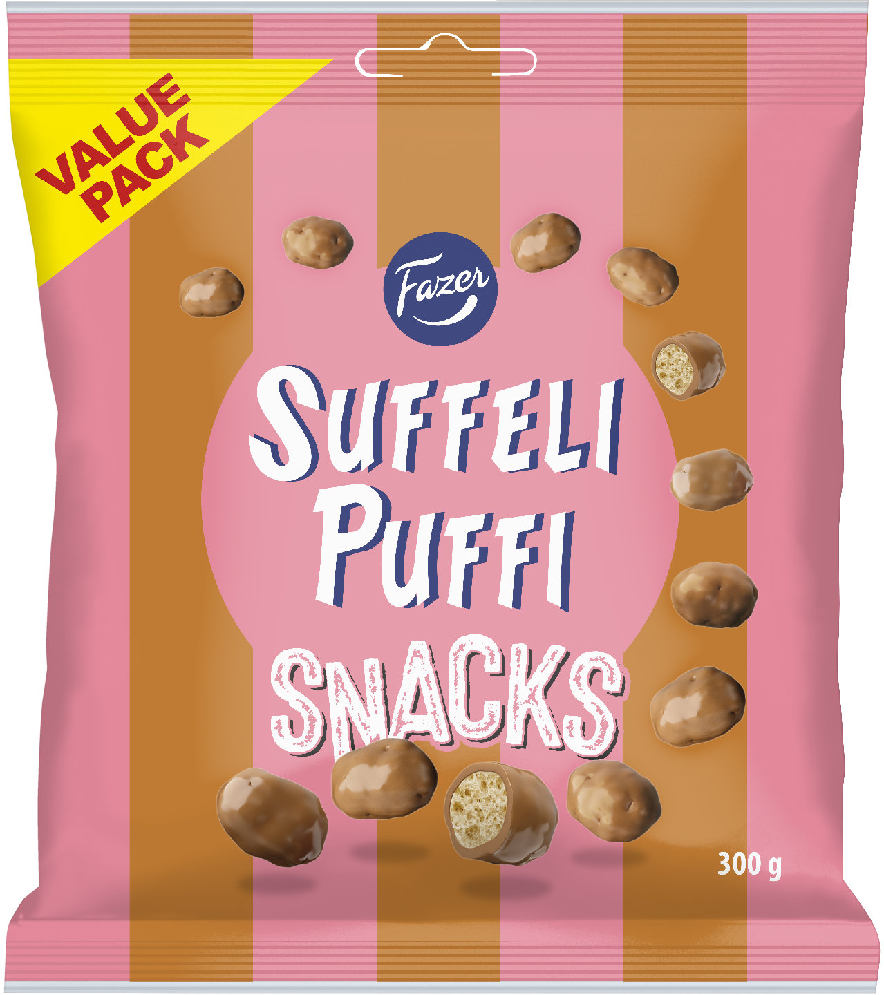 Fazer Suffeli Puffi Snacks pussi 300g. Suffeli Puffi Snacks -makeisten suklaanmakuisen kuorrutteen alta paljastuu ihanasti rouskahtava maissipuffi. Noudatamme kaakaonhankinnassamme Fazerin kaakaovisiota. Lue lisää www.fazercocoavision.com. Nauti Suffeli Puffi Snacks value pack-pussi ystävien tai perheen kanssa!