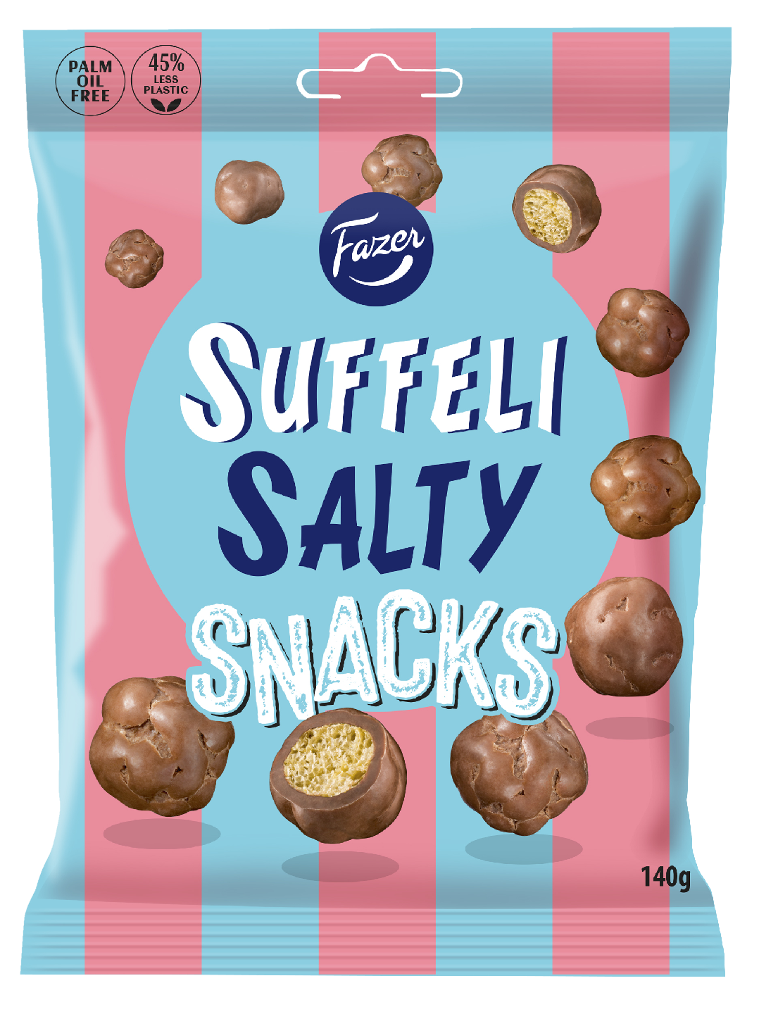 Suffeli on rapea klassikko, joka on ihastuttanut jo vuodesta 1966. Suffeli Salty Snacks -makeisten suklaanmakuisen kuorrutteen alta paljastuu ihanasti rouskahtava suolaisen makea maissipuffi. Noudatamme kaakaonhankinnassamme Fazerin kaakaovisiota. Lue lisää www.fazercocoavision.com. Herkuttele itse tai jaa ystävien kanssa!