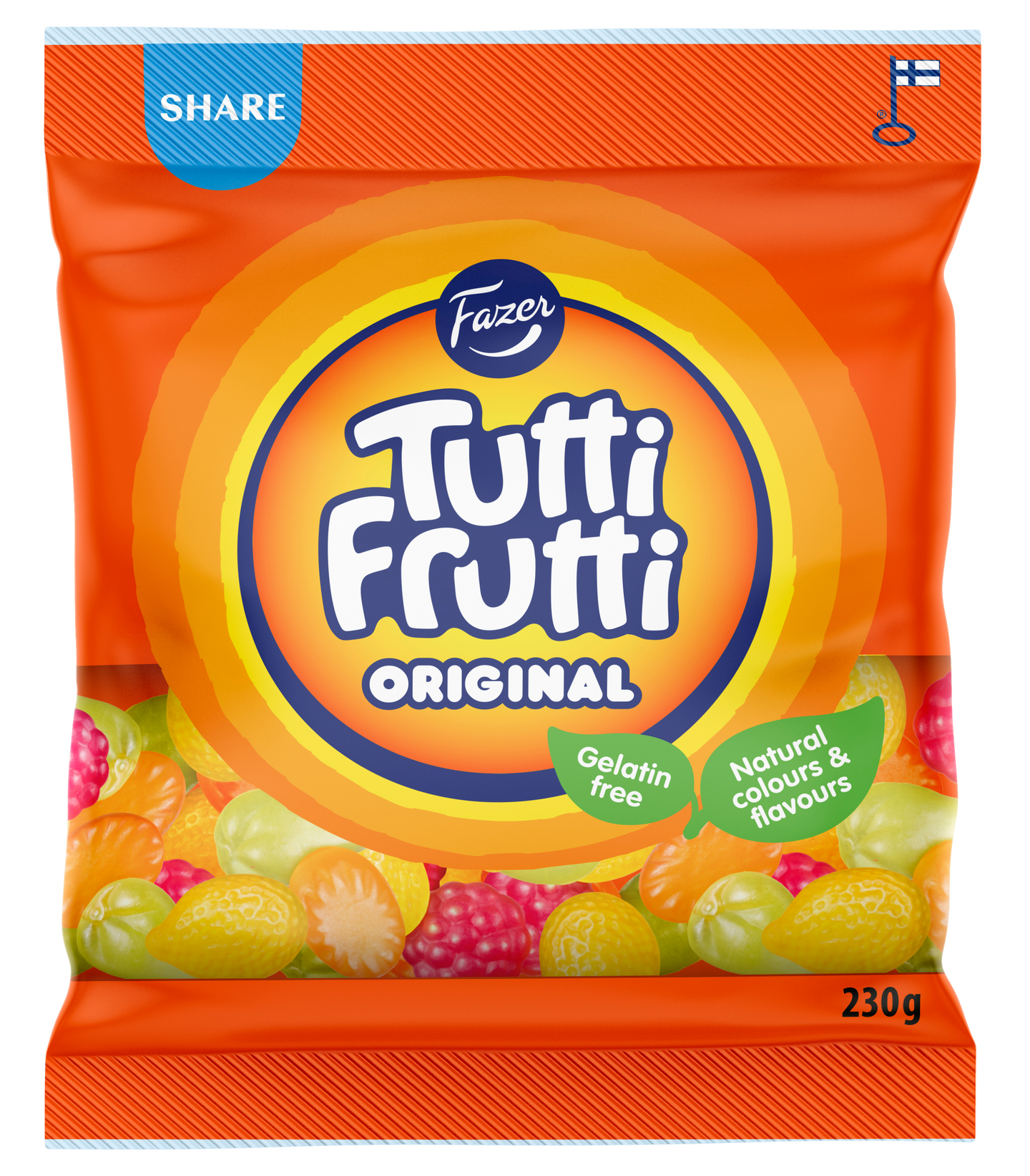 Hedelmäinen Tutti Frutti tuo iloa ja aurinkoa kaikille. Tutti Frutti Original on pirteä sekoitus hedelmäisiä makuja: vadelmaa, päärynää, sitruunaa ja uniikkia Tutti Fruttia. Nämä aidot ja alkuperäiset hedelmäkarkit ovat luontaisilla väreillä valmistettu, palmuöljytön, gelatiiniton ja vegaaninen. Raikkaan makunsa karkit saavat luontaisista aromeista. Täydellinen nautittavaksi yhdessä ystävien kanssa tai omaan herkutteluun.