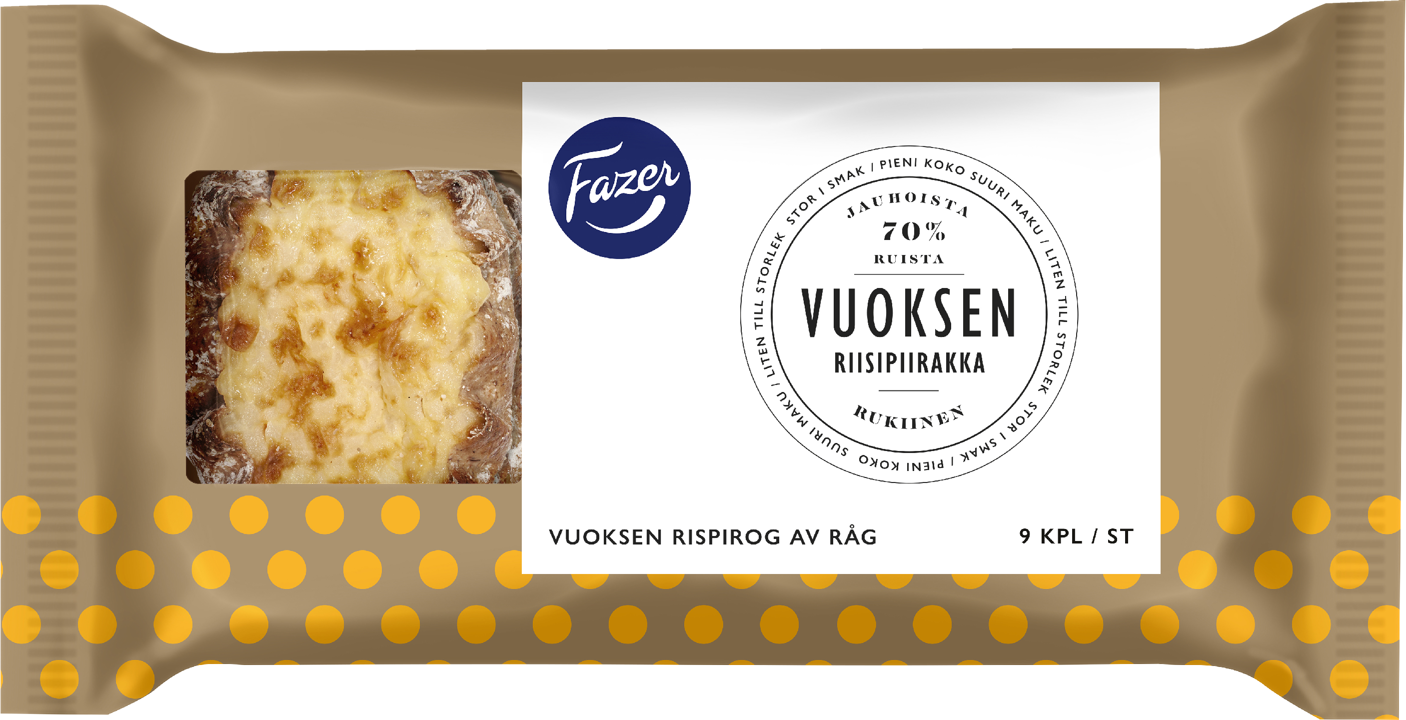 LaktoositonFazer Vuoksen Riisipiirakan aito rukiinen kuori ja täyteläinen riisipuuro takaavat makuelämyksen. Pienemmän kokonsa takia se sopii hyvin vaikka juhlapöytään.