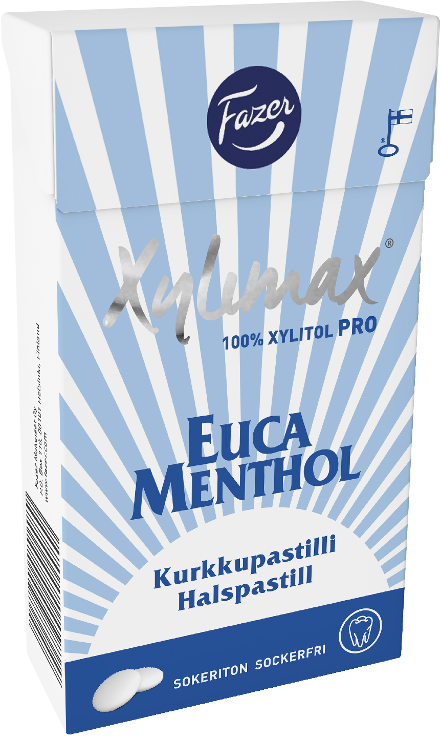 Kotimaiset Xylimax täysksylitolipastillit tuovat raikkautta elämääsi. Xylimax Eucamenthol on täysin ksylitolilla makeutettu, raikkaan eukalyptuksen ja mentolin makuinen soikea pastilli. Pastilli on helppo napata kätevästä rasiasta hampaiden suojaksi ruokailun jälkeen, ja se auttaa myös käheään kurkkuun ja kuivaan suuhun. Makeutettu kotimaisella Fazer Xylitol-makeutusaineella, joka on valmistettu vastuullisesti oman myllyn kauran kuorista.