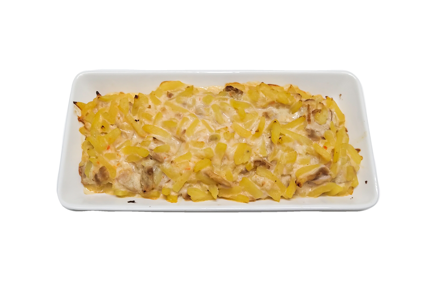Peruna, broilerinliha 20 % [broilerinliha (Suomi), vesi, jodioitu suola, stabilointiaine (E450, E451), perunakuitu, aromit, glukoosi, happamuudensäätöaine (E262)], gluteeniton kauravalmiste [kaurapohja (vesi, gluteeniton KAURA), rapsiöjy, emulgointiaine (E472e), stabilointiaine (E415), hapettumisestoaine (E307)], vesi, porkkana, palsternakka, muunnettu perunatärkkelys, jodioitu suola.