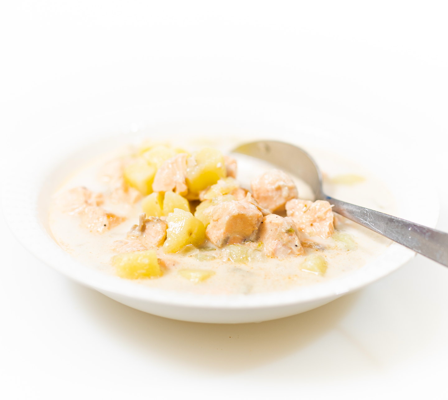 MaidotonKypsä nesteetön ainesseos maukkaan lohikeiton valmistamiseksi, vakuumipakkaus. Maidoton, gluteeniton.