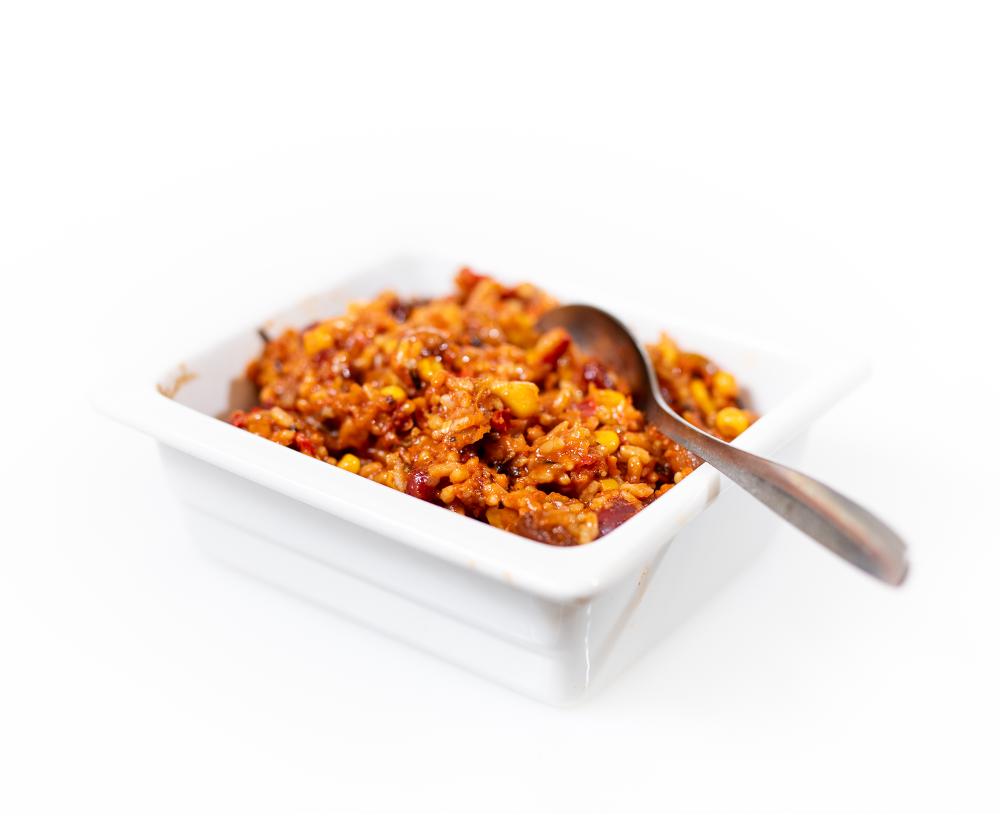 Vesi, sipuli, maissi, paprika, tomaattipyree, ruskea papu, villiriisi, kidneypapu, rapsiöljy, sokeri, tacomausteseos 2 % [chilipippuri, juustokumina, valkosipuli, rypälesokeri, sipuli, suola, oregano, hiivauute, perunatärkkelys, perunakuitu, pakkuuntumisenestoaine (E551), mausteuute (paprika)], vihreä jalapeno [vihreä jalapeno, vesi suola, viinietikka, happamuudensäätöaine (E330), stabilointiaine (E509)], jodioitu suola, paprikajauhe, mustapippuri.