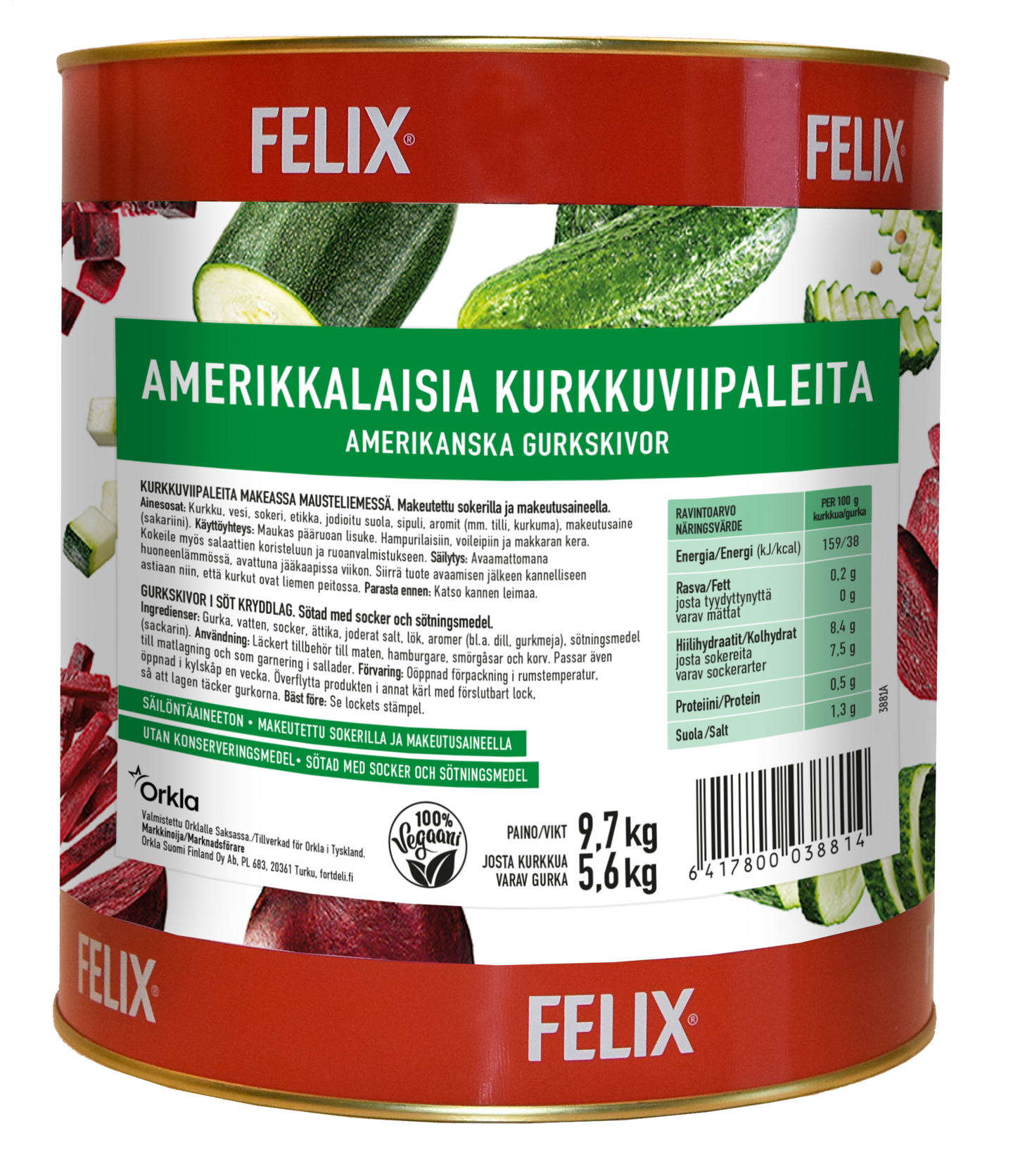 VegaaninenFelix® Amerikalaiset kurkkuviipaleet ovat maukkaita lisukkeita sellaisenaan. Myös hampurilaisiin tai voileipiin ja makkaran kera. Kokeile myös salaattien koristeluun ja ruoanvalmistukseen.