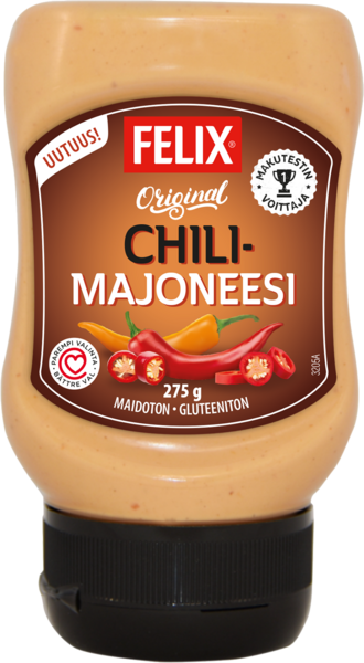 Rapsiöljy, vesi, sokeri, punaviinietikka, muunnettu perunatärkkelys, MUNANKELTUAISJAUHE 1,5 %, tomaattisose, chili 1,5 %, väkiviinaetikka, jodioitu suola, mausteet (mm. sipuli, valkosipuli, paprika), väri (paprikauute), sakeuttamisaine (ksantaanikumi), happo (maitohappo), säilöntäaine (kaliumsorbaatti), hapettumisenestoaine (E385). Saattaa sisältää pieniä määriä maapähkinää.