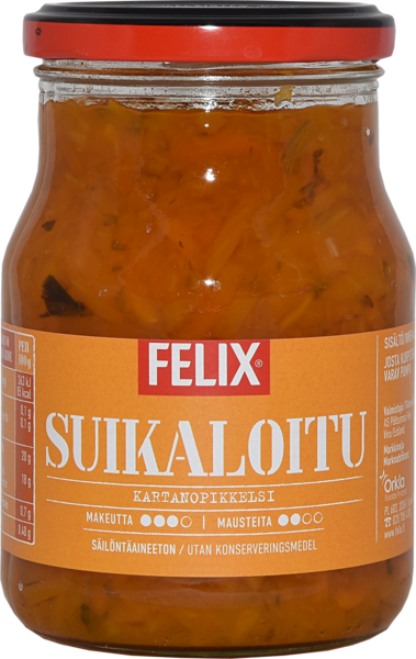 VegaaninenNappaa hyllystä mukaasi Felix® Kartanopikkelssi. Kartanopikkelssi on herkulliseen maustelimeen säilöttöyä, suikaloitua kurpitsaa ja se sopii erinomaisesti erilaiseen ruuanlaittoon, kylmiin kastikkeisiin tai sellaisenaan ruuan oheen. Kokeile ja ihastu. Felix Kartanopikkelssin on säilöntäaineeton ja sopii vegaanista ruokavaliota noudattavalle. Felix - herkkuja ruokapöytään®.