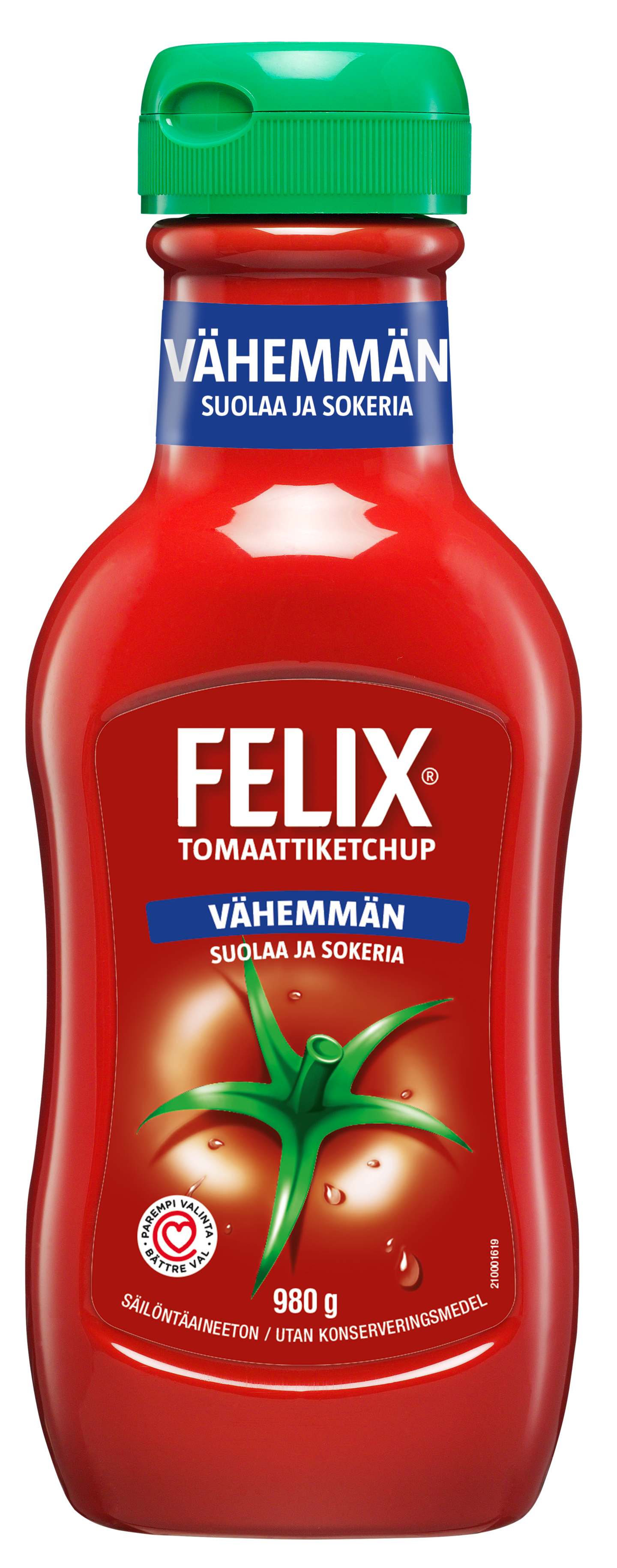 VegaaninenFelix® Ketchup vähemmän suolaa ja sokeria sisältää nimensä mukaisesti 35% vähemmän suolaa ja sokeria kuin ketsupit keskimäärin. Mausta ei silti tarvitse tinkiä, sillä tämä ketsuppi on maultaan runsaan tomaattinen ja täyteläisen mausteinen. Tomaattipitoisuus on korkea, 83%. Vähennetyn suolan ja sokerin ansiosta tuotteelle on myönnetty terveyden kannalta paremmasta vaihtoehdosta kertova Sydänmerkki. Tuote on myös säilöntäaineeton. Felix Ketchup on vastuullinen valinta, olemme pyrkineet minimoimaan tuotteen valmistuksesta aiheutuvat hiilidioksidipäästöt. Lue lisää felix.fi. Felix - herkkuja ruokapöytään®..