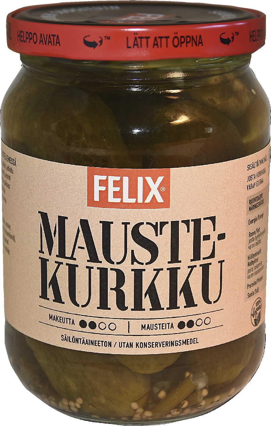 VegaaninenFelix® Kokonainen Maustekurkku taipuu moneen. Sen voi syödä sellaisenaan pieneen suolaisen nälkään ja sen voi viipaloida tai kuutioida haluamallaan tavalla lisukkeeksi tai raaka-aineeksi erilaiseen ruuanlaittoon. Suosikista on siis moneksi. Vinkki: hyödynnä kurkun erinomainen mausteliemi ruuanlaitossa, esimerkiksi maustamaan keittoja tai kastikkeita. Felix kokonainen maustekurkku-purkissa on Helppo avata -kansi, joka on käytössä vaivaton. Kokonainen maustekurkku sopii myös vegaanista ruokavaliota noudattaville. Felix - herkkuja ruokapöytään®.