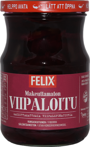 VegaaninenFelix® Makeuttamaton viipalepunajuuri on mainio tuote niille, jotka haluavat välttää sokerin käyttöä, sillä näihin punajuuriin ei ole lisätty lainkaan sokeria. Kokeile esimerkiksi omatekoisen juuresmuusin raaka-aineena, makeuttamaton punajuuri antaa musille sekä makua että näköä. Felix punajuuret ovat myös terveellinen vaihtoehto, sillä ne ovat runsaskuituisia. Tuote on säilöntäaineeton ja sopii vegaanista ruokavaliota noudattavalle. Lisäksi purkissa on helppo avata -kansi, joka lisää käyttömukavuutta. Felix - herkkuja ruokapöytäään®.