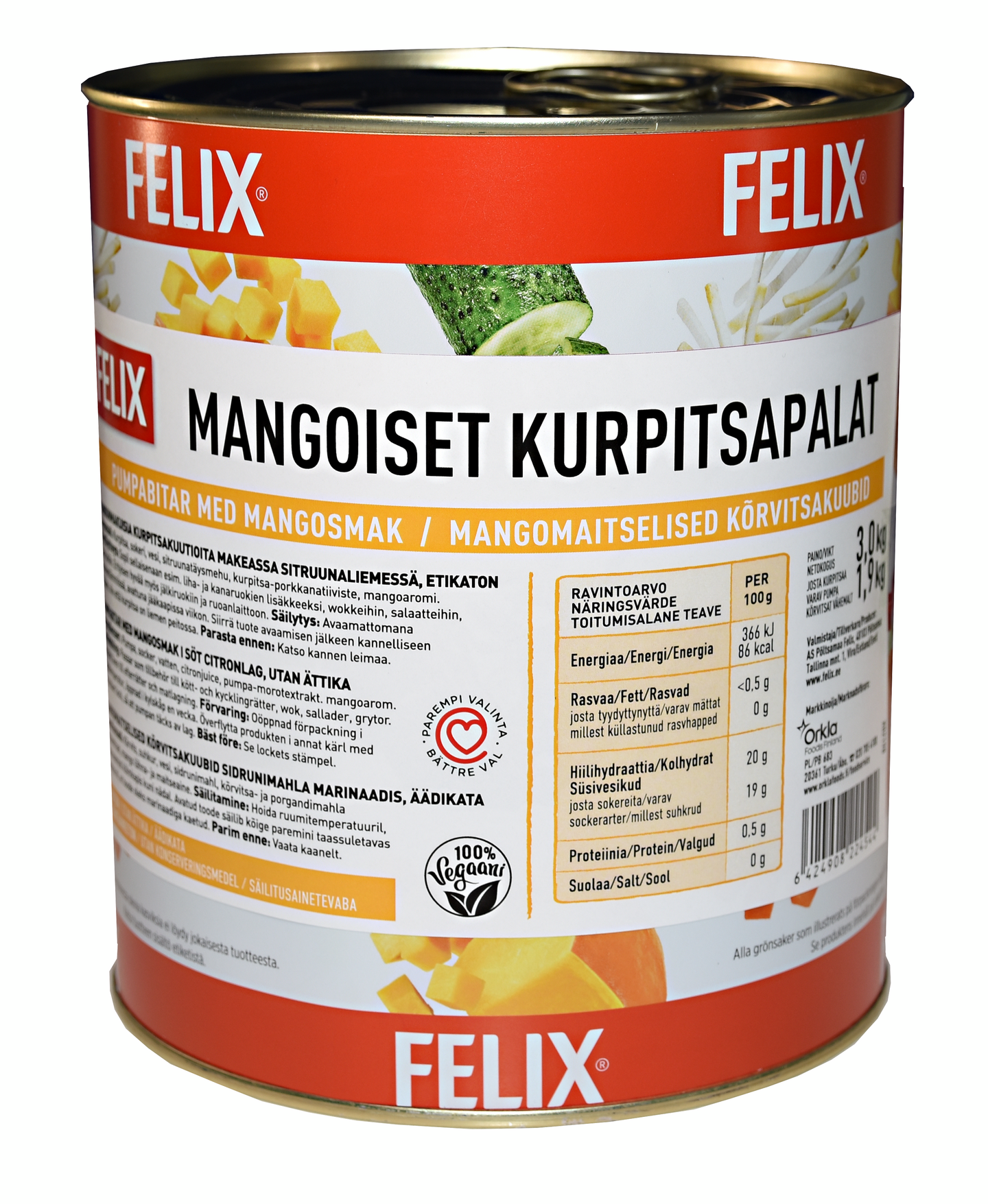 Felix mangoiset kurpitsapalat mausteliemessä etikaton 3,0kg/1,9kg