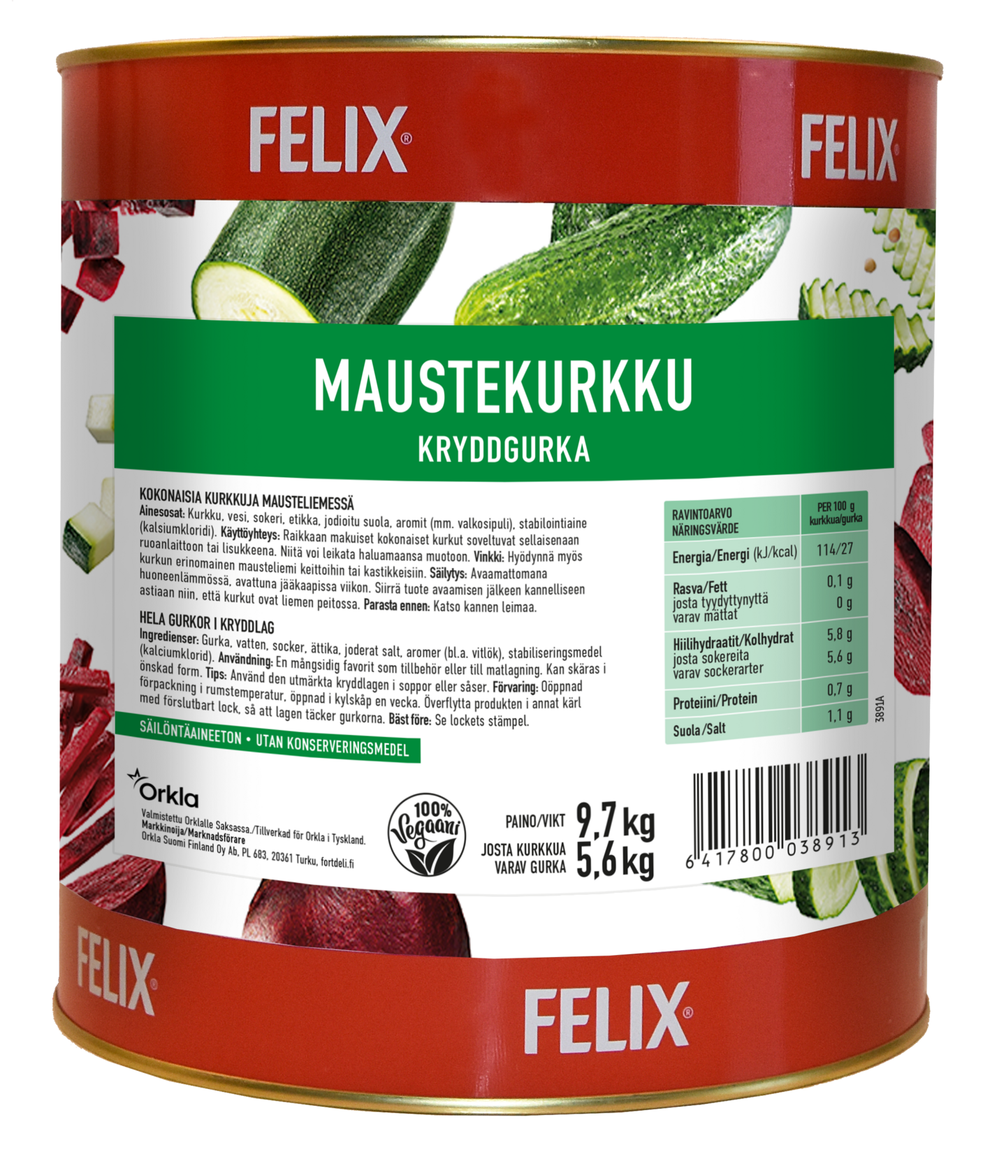 VegaaninenRaikkaan makuiset Felix® kokonaiset maustekurkut soveltuvat sellaisenaan ruoanlaittoon tai lisukkeena. Niitä voi leikata haluamaansa muotoon. Vinkki: hyödynnä myös kurkun erinomainen mausteliemi keittoihin tai kastikkeisiin.