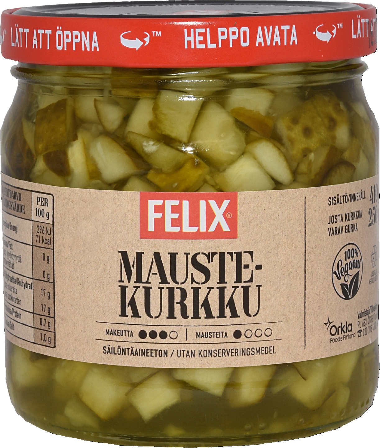 VegaaninenFelix® Maustekurkkukuutio on nimensä mukaisesti kuutioitua maustekurkkua. Kuutiot ovat juuri sopivan kokoisia erilaisiin salaatteihin ja antavat lisämakua ruokaisiin tai kylmiin kastikkeisiin. Maustekurkkukuutio on myös ehdoton apu joulurosollin valmistuksessa, kaveriksi sopii loistavasti Felix Punajuurikuutio. Felix Maustekurkkukuutiolla lisäät ruokaan helposti makua, helppo avata -kansi on kätevä käytössä. Maustekurkkukuutio on kaiken lisäksi pakattu sopivan pieneen purkkiin. Tuote on säilöntäaineeton ja sopii vegaanista ruokavaliota noudattavalle. Felix - herkkuja ruokapöytään®.