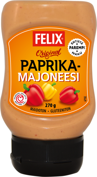 MaidotonFelix® Paprikamajoneesi sopivan mieto, mutta samalla mausteinen ja täyteläinen majoneesi, maukas ja monikäyttöinen. Paprikamajoneesi on yksi suosituimmista majoneesimauista, ja se tuo lisämakua esimerkiksi grilliruoille, kanalle tai perinteisille lihapullille. Paprikamajoneesi sopii hyvin myös dippailuun - kokeile ranskanperunoille tai vihannestikuille. Kaunis väri on houkutteleva ja lisää ruokahalua. Parannettu Felix Paprikamajoneesi vastaa nyt myös paremmin kuluttajien toiveita. Tuotteelle on myönnetty terveellisemmästä valinnasta kertova Sydänmerkki. Felix - Herkkuja ruokapöytään®.