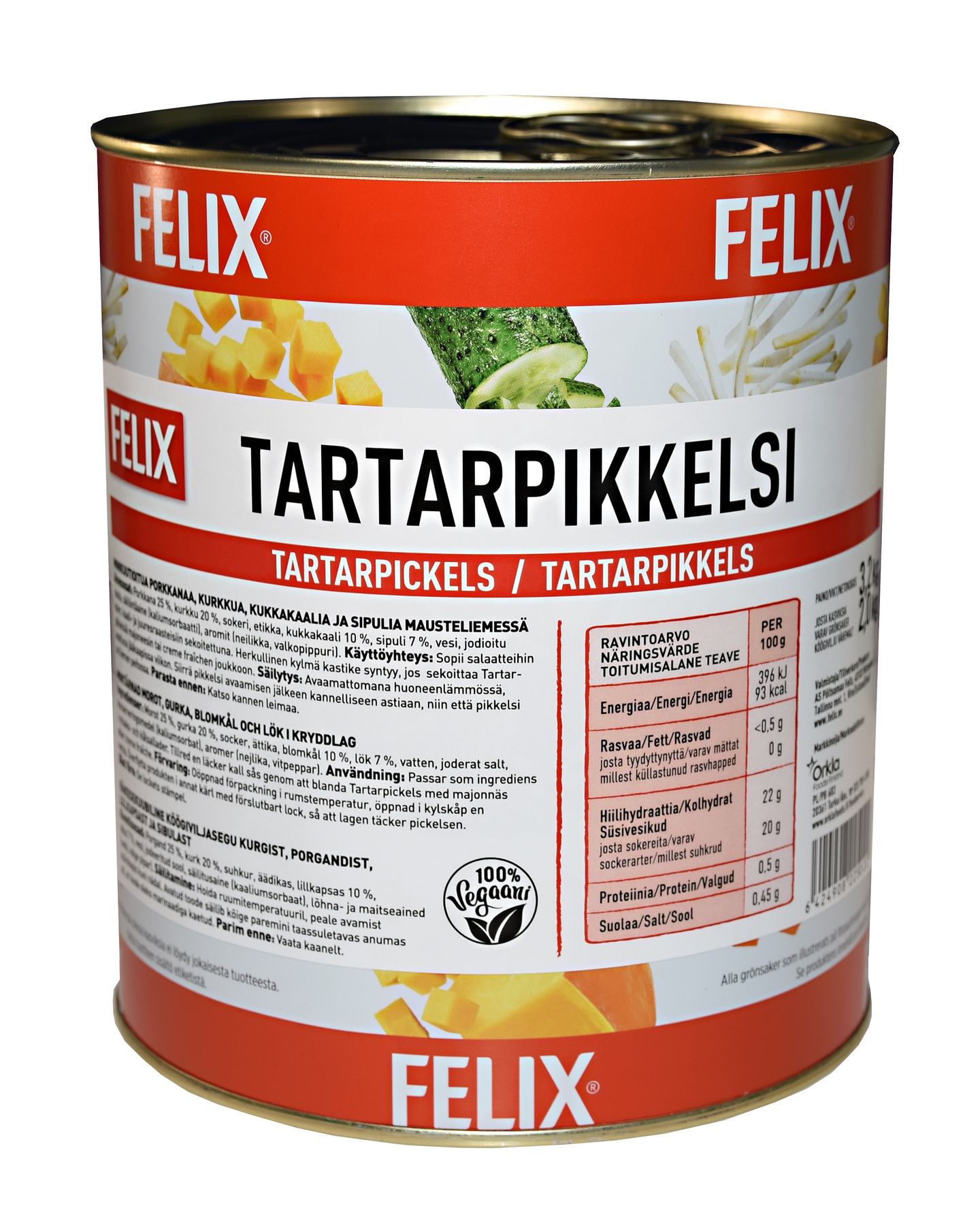 VegaaninenFelix® Tartarpikkelsi sopii kaali- ja juuresraasteisiin sekoitettuna. Herkullinen kylmä kastike syntyy sekoittamalla Tartarpikkelsiä majoneesin tai créme fraîchen joukkoon.