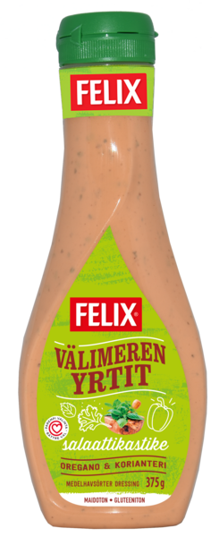 MaidotonFelix® Välimeren Yrtit Salaattikastike tuo keittiöösi tuulahduksen Välimereltä. Tähän kastikkeeseen täyteläistä ja herkullista makua tuovat yritit, kuten persilja, baslika, oregano ja korianteri. Felix Välimeren Yrtit salaattikastike on kehitetty erityisesti välimerellisten salaattien oheen, kuten katkarapu- ja pastasalaateille. Kastike sopii mainiosti myös dippikastikkeeksi vihanniksille. Felix Välimeren Yrtit salaattikastike on maidoton ja gluteeniton. Lisäksi kastikkeelle on myönnetty terveyden kannalta paremmasta vaihtoehdosta kertova Sydämnerkki.
