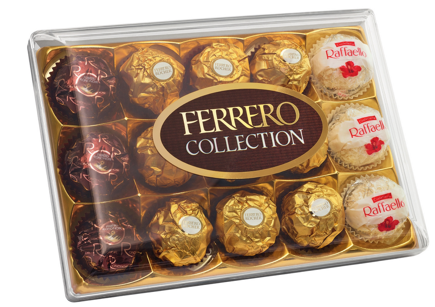 Ferrero Rocher: MAITOSUKLAA 30% (sokeri, kaakaovoi, kaakaomassa, rasvaton MAITOJAUHE, VEDETÖN MAITORASVA ,emulgointiaine: lesitiinit (SOIJA); vanilliini), HASSELPÄHKINÄÄ (28,5%), sokeri, palmuöljy ,VEHNÄJAUHO, HERAJAUHE MAITO, vähärasvainen kaakao, emulgointiaine: lesitiinit (SOIJA), nostatusaineet (natriumvetykarbonaatti), suola, vanilliini. Raffaello: Kuivattu kookos 25,5%, kasvirasvat (palmu, shea), sokeri, MANTELI (8%), rasvaton MAITOJAUHE, HERAJAUHE MAITO, VEHNÄJAUHO, tapiokatärkkelys, emulgointiaine: lesitiinit (SOIJA), aromit, nostatusaine (natriumvetykarbonaatti), suola. Ferrero Rondnoir: Tumma suklaa 40,5% (sokeri, kaakaomassa, kaakaovoi, emulgointiaine: lesitiinit (SOIJA); vanilliini), sokeri, palmuöljy, VEHNÄJAUHO, vähärasvainen kaakao (5,5%), HERAJAUHE MAITO, rasvaton MAITOJAUHE, VEHNÄTÄRKKELYS, auringonkukkaöljy, MAITOSUKLAA (sokeri, kaakaovoi, TÄYSMAITOJAUHE, kaakaomassa, emulgointiaine: lesitiinit (SOIJA); vanilliini), kaakaovoi, emulgointiaine: lesitiinit (SOIJA), MAITOPROTEIINIT, pintakäsittelyaineet (arabikumi), kaakaomassa,nostatusaineet (natriumkarbonaatti, ammoniumkarbonaatti), suola, vanilliini. Saattaa sisältää MANTELIA ja HASSELPÄHKINÄÄ.
