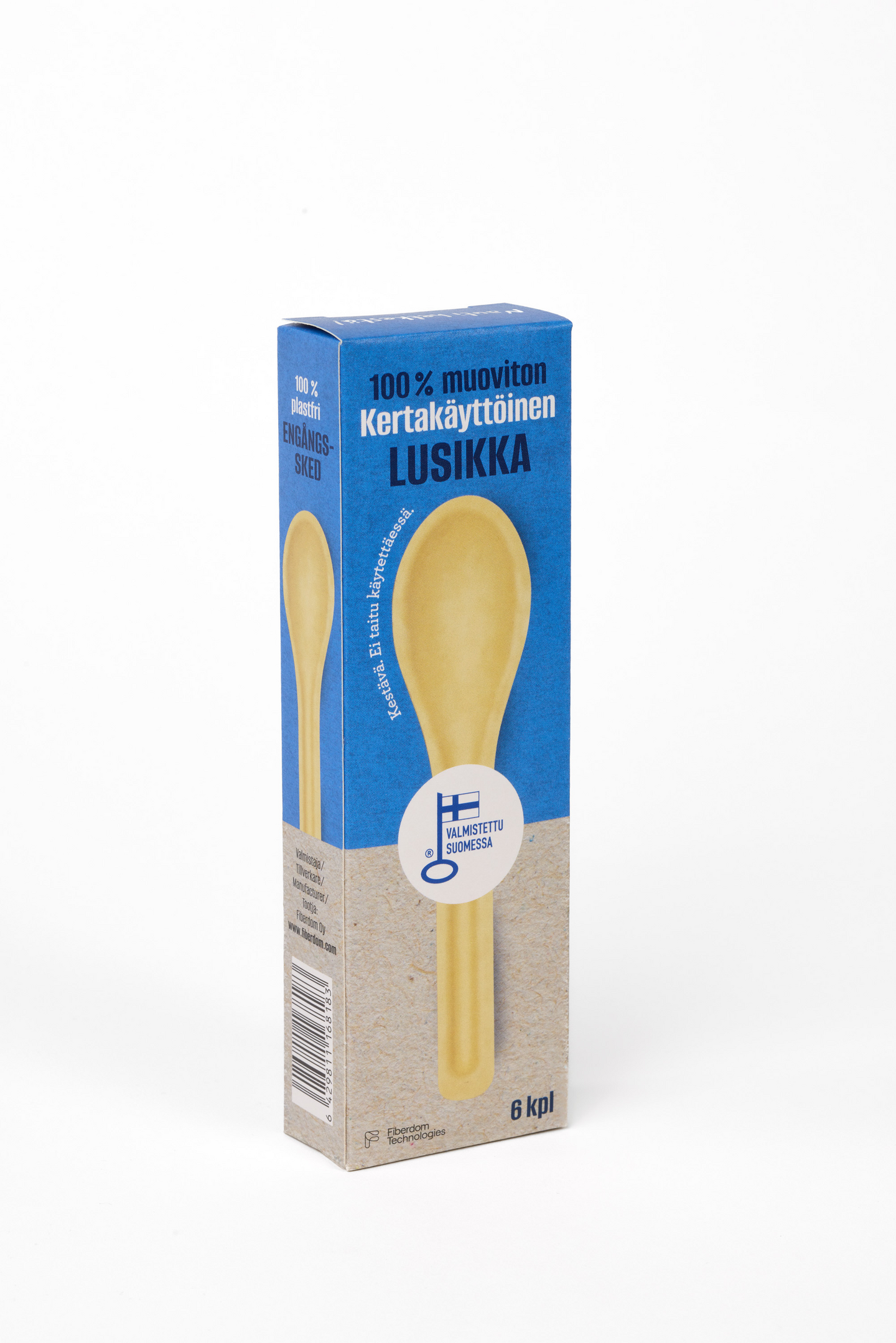 Kertakäyttölusikka, 100 % muoviton, valmistettu Suomessa. Kestävä, ei taivu käytettäessä. Valmistettu FSC-sertifioidusta suomalaisesta mänty- ja kuusipuuselluloosasta. Tuote voidaan kierrättää kartonkina, biojätteenä tai kotikompostoimalla. Pakkaus voidaan kierrättää kartonkina.