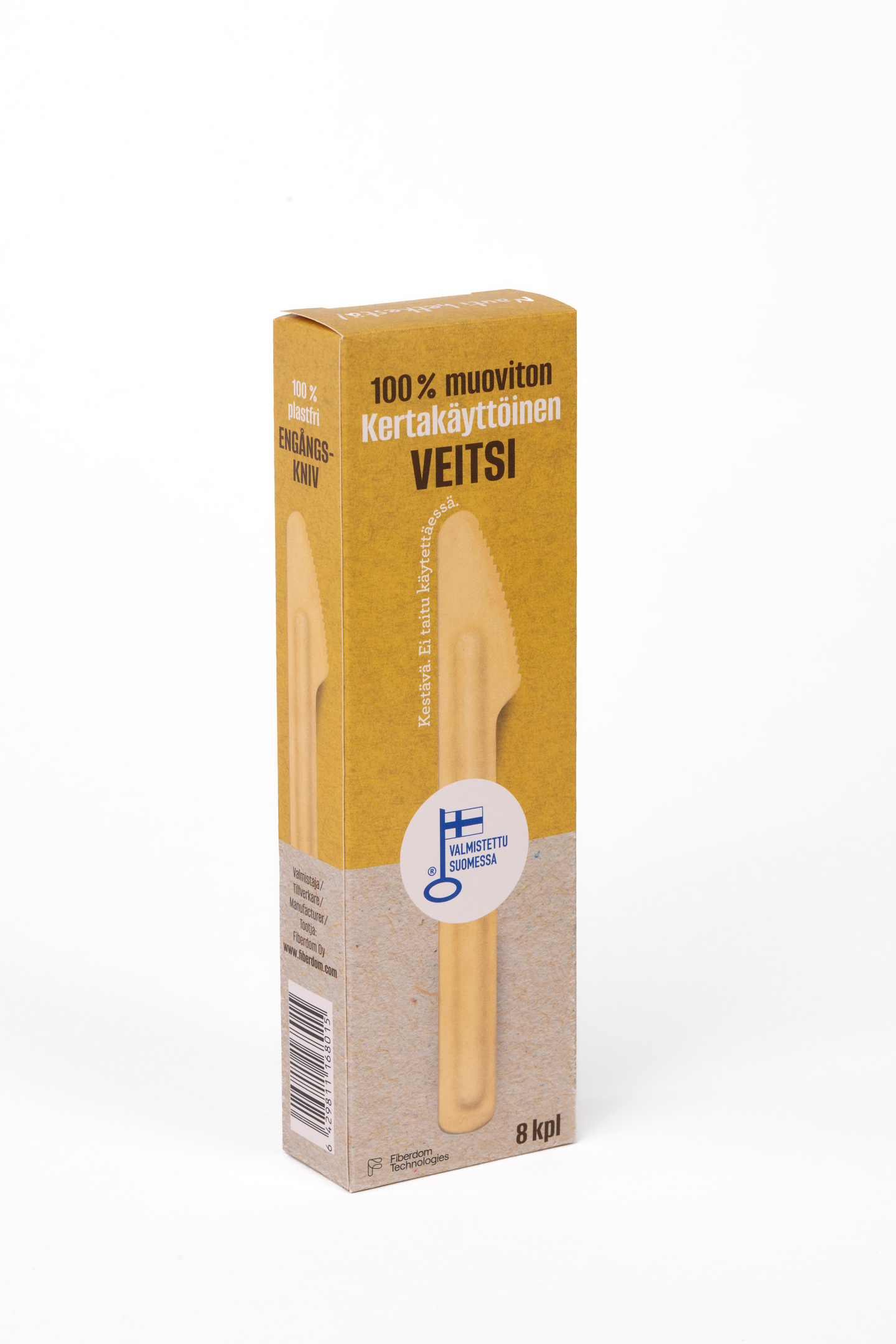 Kertakäyttöveitsi, 100 % muoviton, valmistettu Suomessa. Kestävä, ei taivu käytettäessä. Valmistettu FSC-sertifioidusta suomalaisesta mänty- ja kuusipuuselluloosasta. Tuote voidaan kierrättää kartonkina, biojätteenä tai kotikompostoimalla. Pakkaus voidaan kierrättää kartonkina.