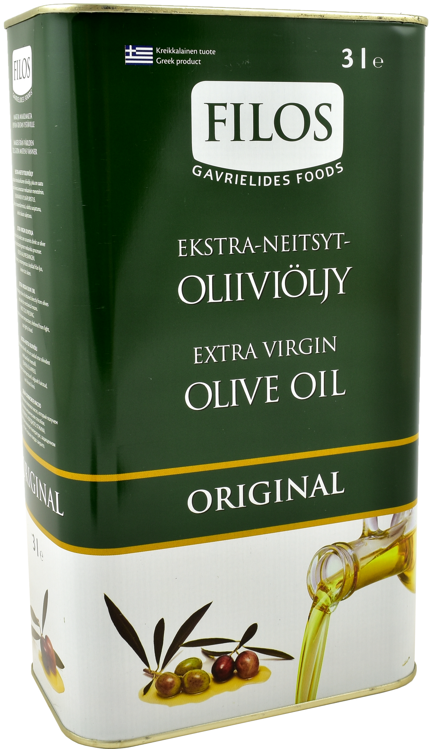 GluteenitonFilos ekstra-neitsytoliiviöljy on korkealuokkainen kreikkalainen oliiviöljy, joka on saatu kylmäerottamalla suoraan oliiveista ja ainoastaan mekaanisin menetelmin. 3 l peltikannu on kätevä talouksissa, joissa öljyä kuluu reilusti.